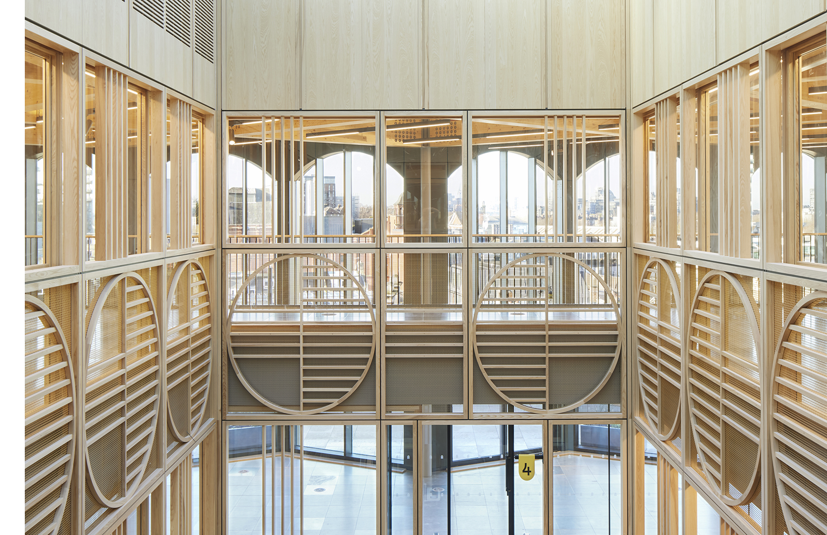 The timber-wrapped core and intricate slat-work at a recently completed Arding & Hobbs development – a rejuvenated 1884 shopping centre in Clapham – is a sight to behold. Stiff + Trevillion’s unique motifs repeat throughout the W.RE building. The balustrade around the escalators is one of the most complex and significant uses of wood slats throughout the scheme.