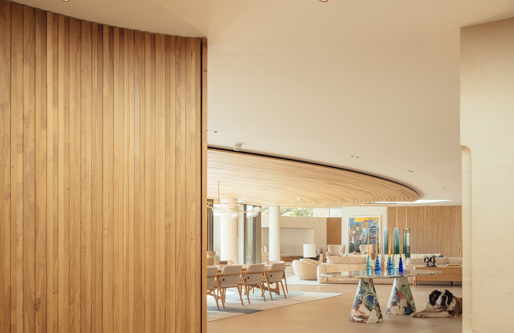 Wood planks are artfully positioned throughout the interior as well, creating curved room partitions, screens and a dramatic ceiling feature. ‘It was a very early ambition to create a rising, sweeping ceiling inspired by the contours of the hillside,’ says Ben Twells, founder of SOTA Design, the practice behind the scheme. ‘Visually it extends from inside to outside connecting internal and external spaces.’ Given the expansive ceiling, he says, painted plaster would have resulted in a ‘sanitised’ feel. The oak ceiling, and the use of timber slats internally and externally, is ‘a triumph’ – in terms of aesthetic atmosphere and technical achievement.