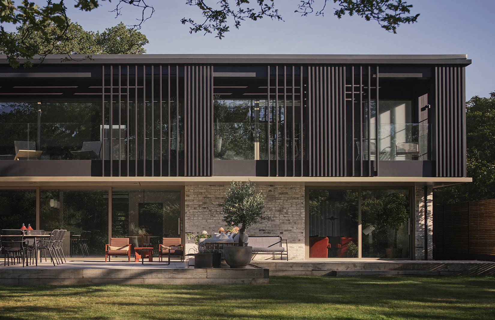 At a contemporary country house in the Cotswolds, timber slats have been used extensively both inside and out to, quite literally, link the old and the new. The restoration connects an original 19th-century Cotswold-stone threshing barn to a modern 10,000sqft wing with a central ‘link’ clad with vertical timber. Bold and architecturally arresting, the neutral palette complements the historic stone so as not to detract from the original barn.