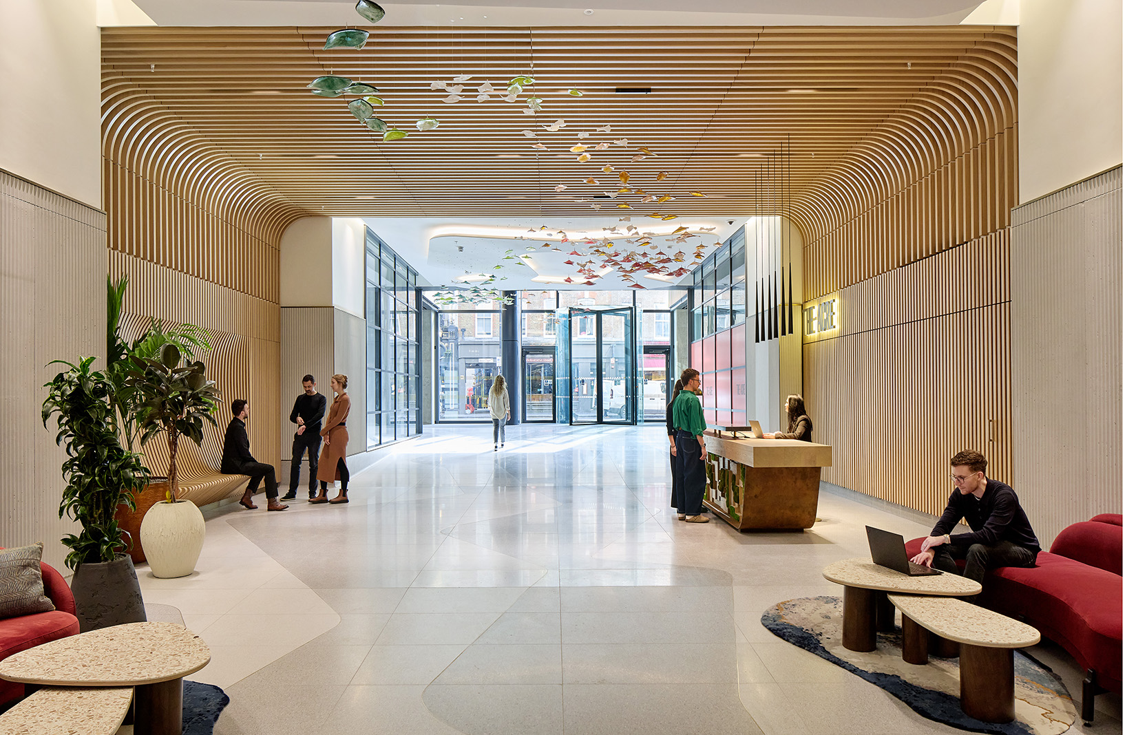 Wood slats bring heart, soul and a nifty seating area to the central atrium of a London office redevelopment. Breathing life into The Acre, a landmark commercial building in Covent Garden dating back to the 1970s, the wood finish not only injects warmth and texture into a large corporate space, but offers lessons on how the material can be used for function as well as form. ‘The slatted panels introduce rhythm and playfulness,’ says Valeria Segovia, design director at Gensler. ‘Wood, as a material, is both linear and fluid.’ The use of planks and slats, she says, allows the material to ‘express structure and create gentle curves evoking familiarity and warmth.’