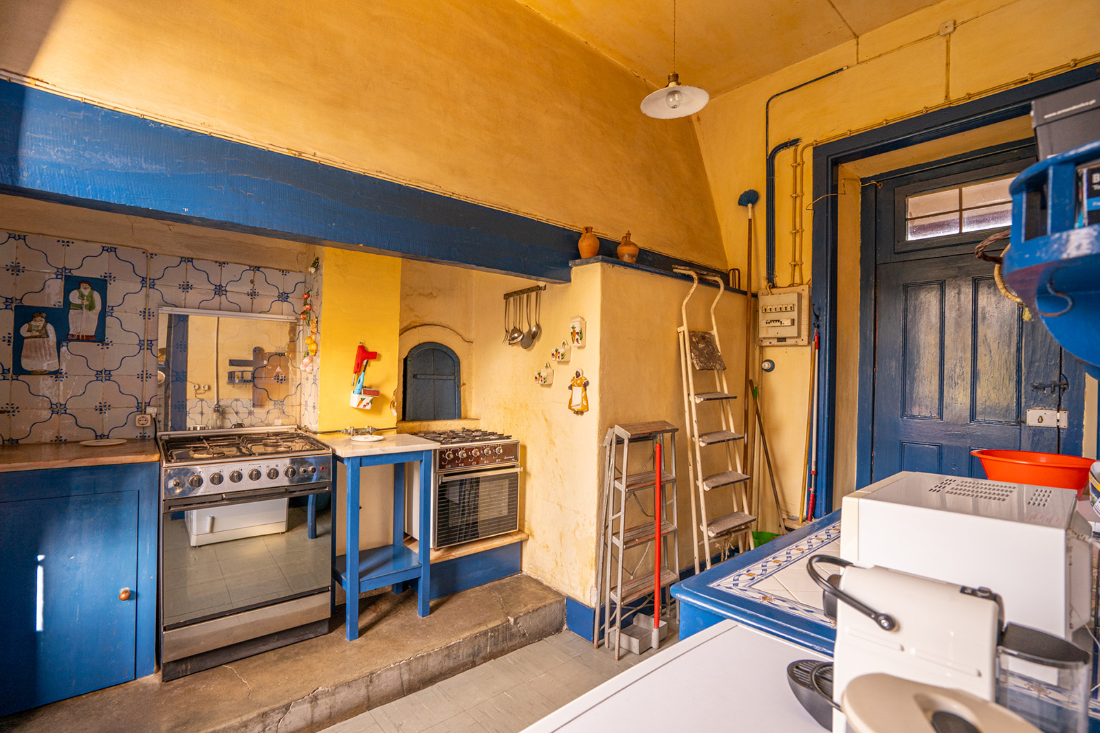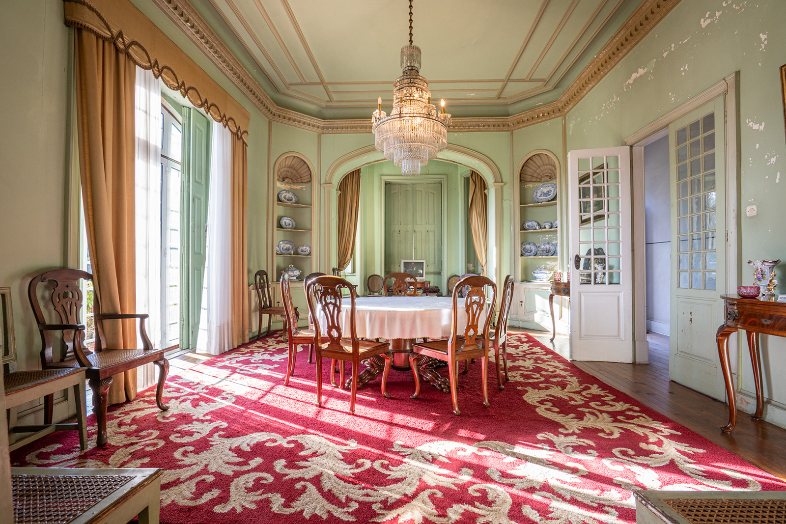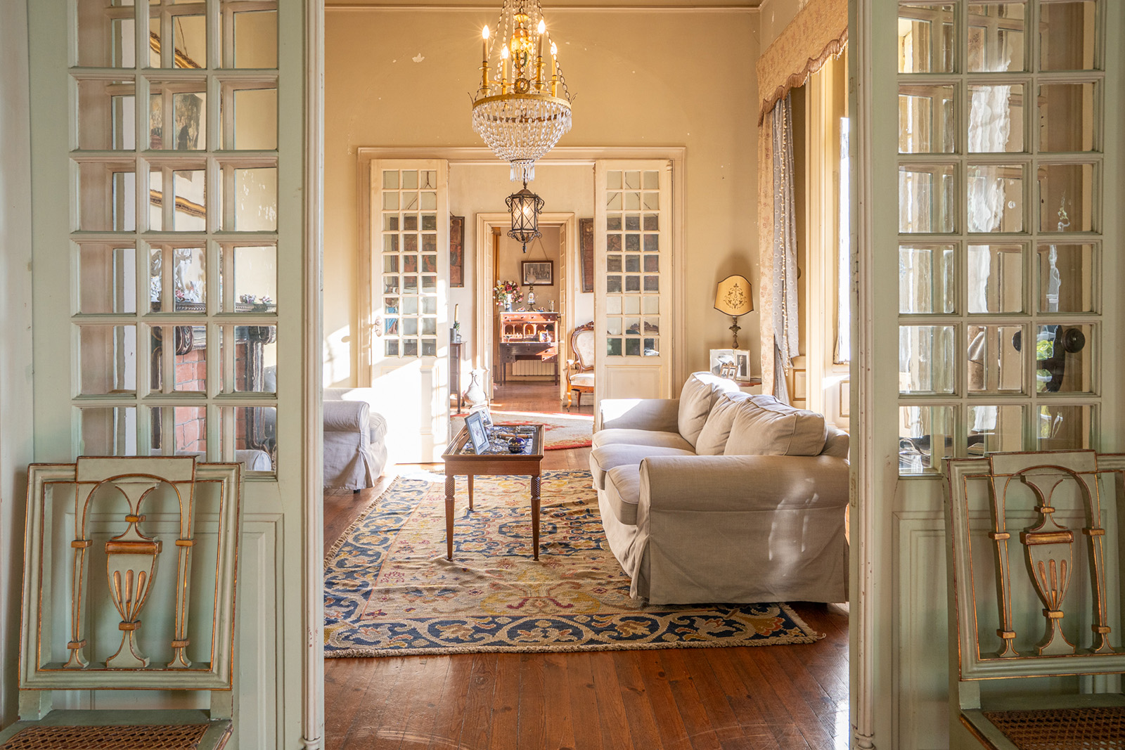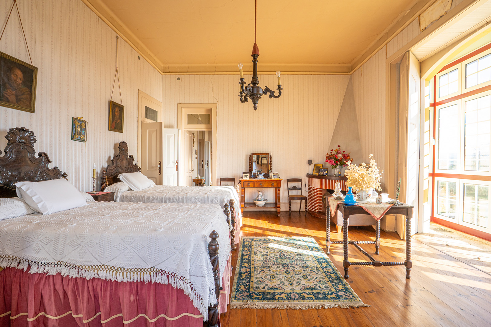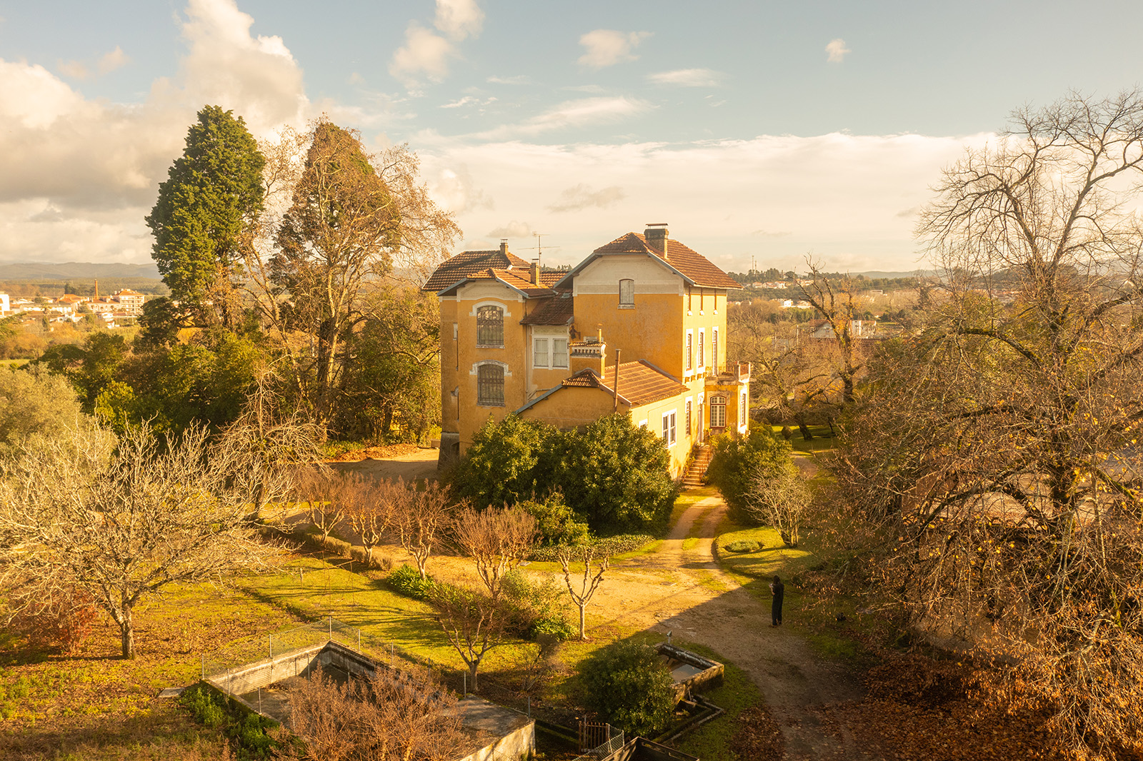 The façade sets the tone — a composed, symmetrical elevation in ochre and white, reached by a stone staircase and edged by a glazed veranda. Built in 1915, Casa Nobre reflects the measured confidence of early 20th-century domestic architecture in central Portugal, where proportion and permanence carried as much weight as decoration.