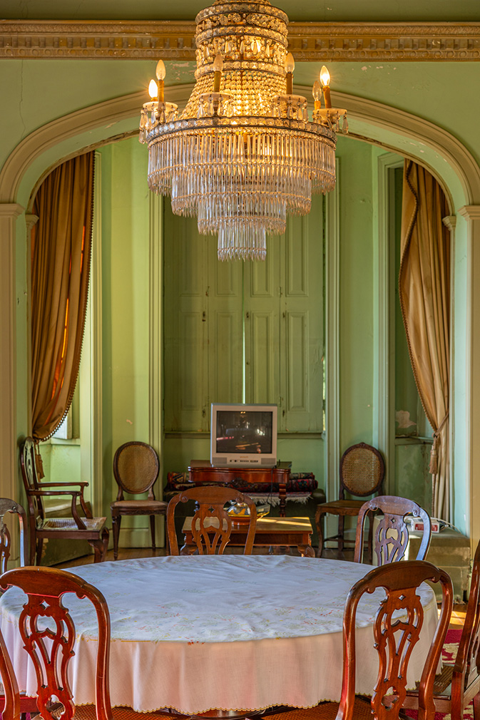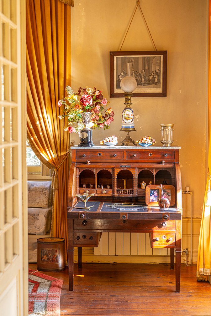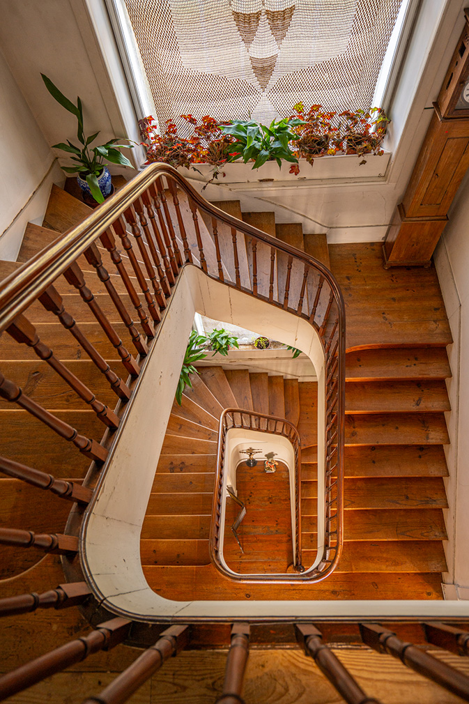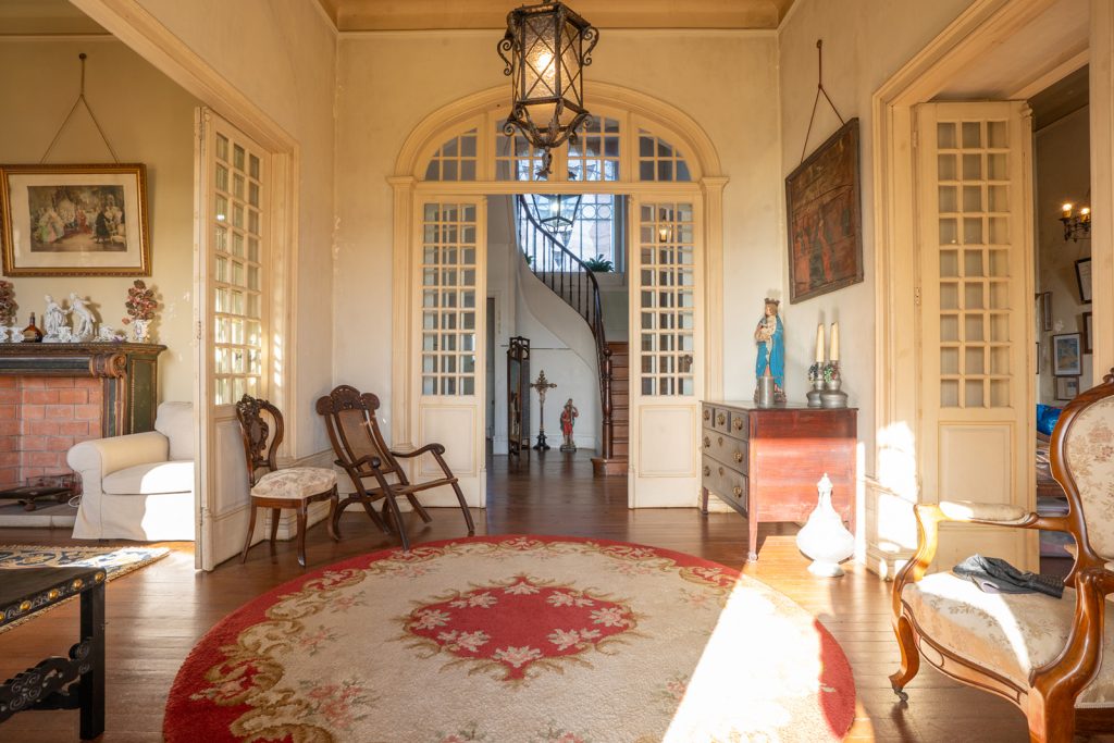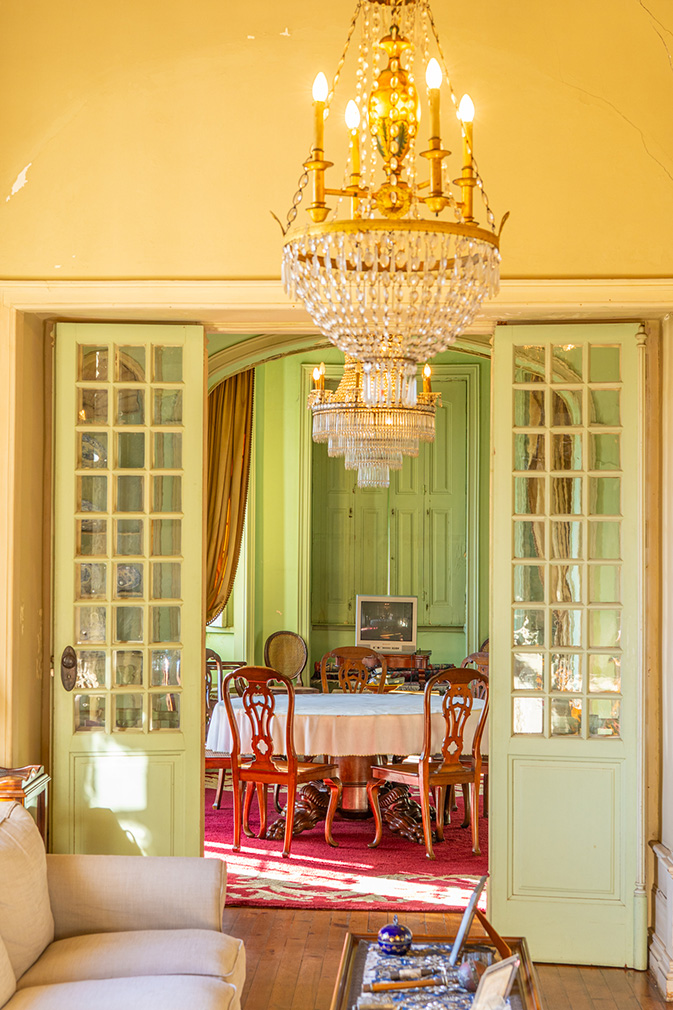 The interior plan remains legible and largely intact. Reception rooms unfold in sequence, their hierarchy reinforced by coloured plaster ceilings, timber floors and original fireplaces. Four bedrooms occupy the first floor, while a habitable attic and a basement with vehicle access extend the building vertically and below ground. Across the wider estate, a secondary house, chapel and a series of ancillary buildings — including a wine cellar and former storage spaces — point to a layered history and clear potential for adaptive reuse.