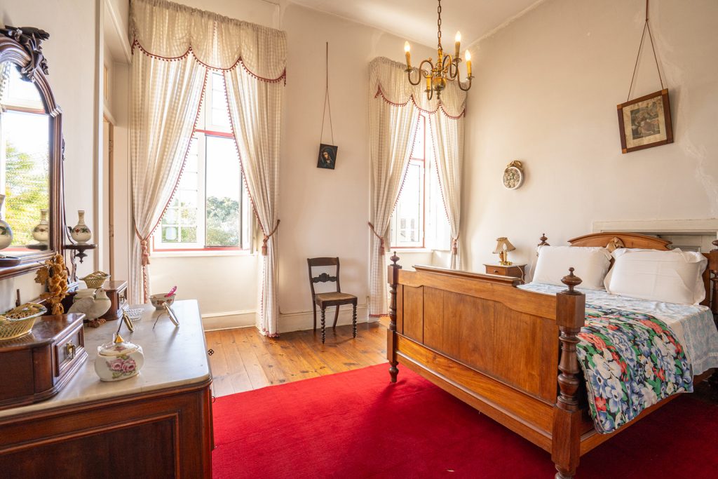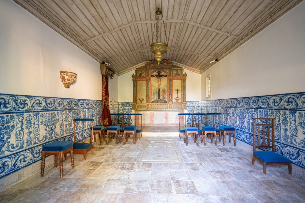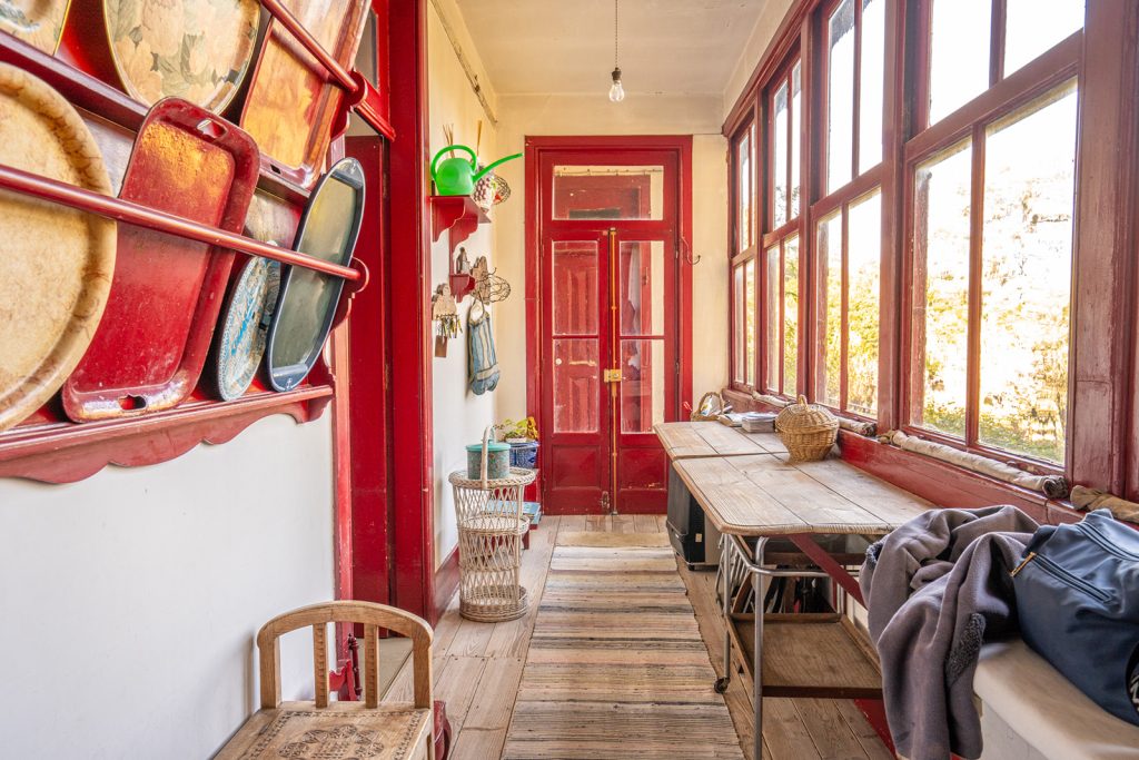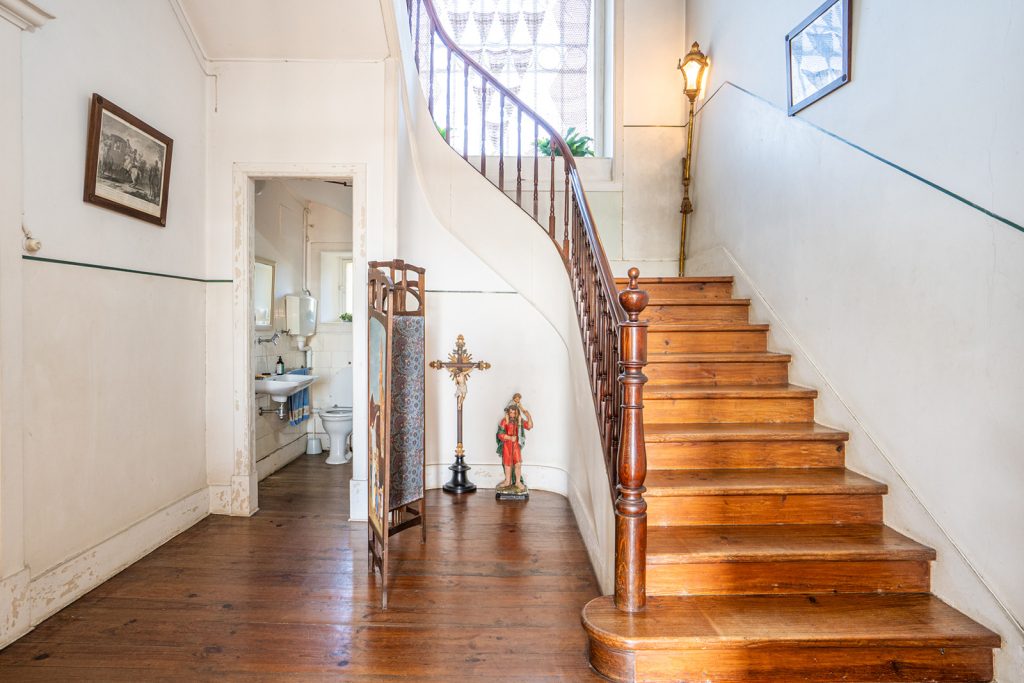The façade sets the tone — a composed, symmetrical elevation in ochre and white, reached by a stone staircase and edged by a glazed veranda. Built in 1915, Casa Nobre reflects the measured confidence of early 20th-century domestic architecture in central Portugal, where proportion and permanence carried as much weight as decoration.