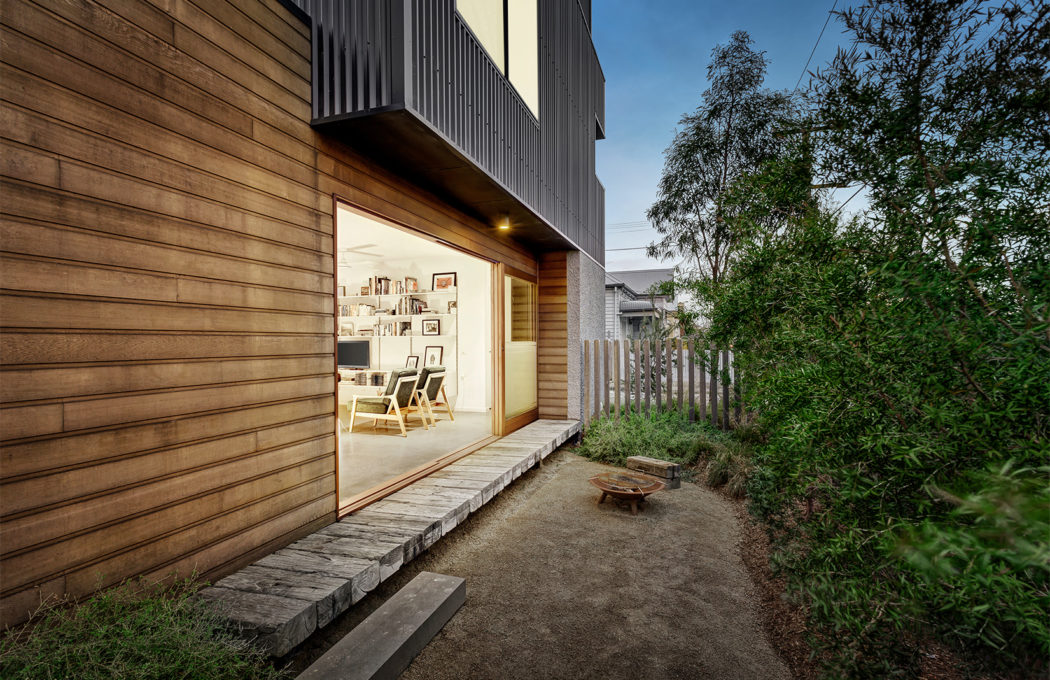 From the outside, the North Street dwelling is arranged as a series of roughly stacked, timber-clad boxes, in contrasting shades of dark and natural woods.