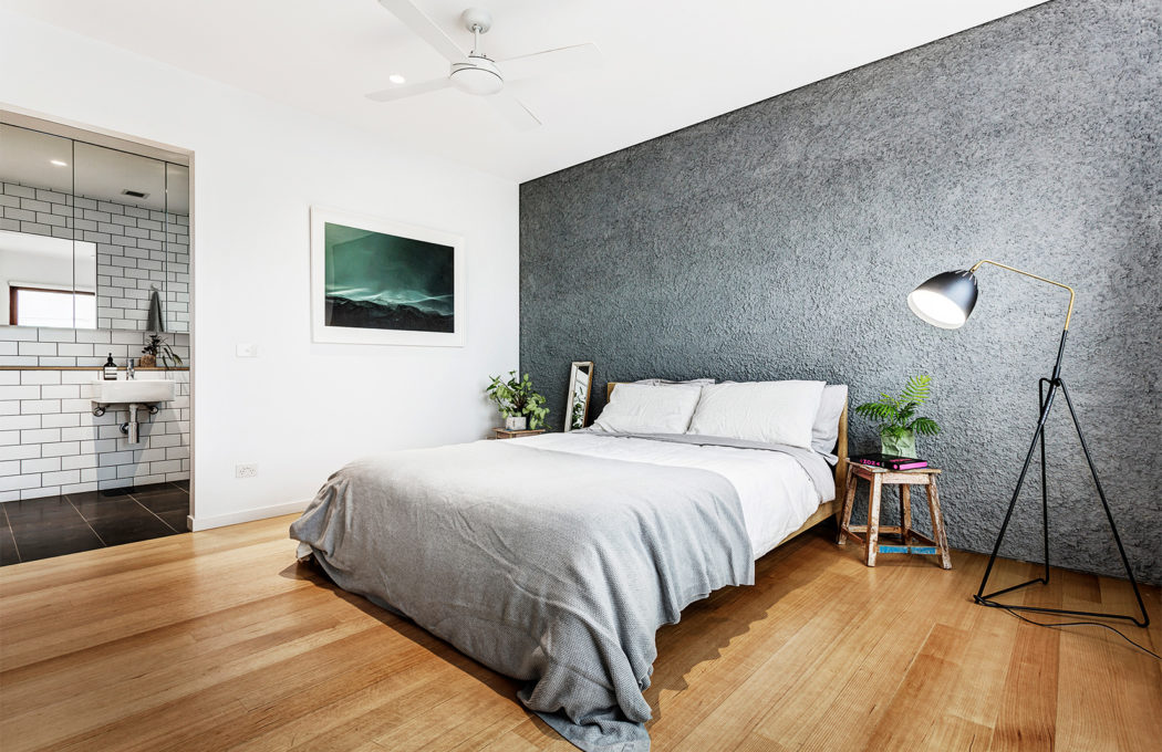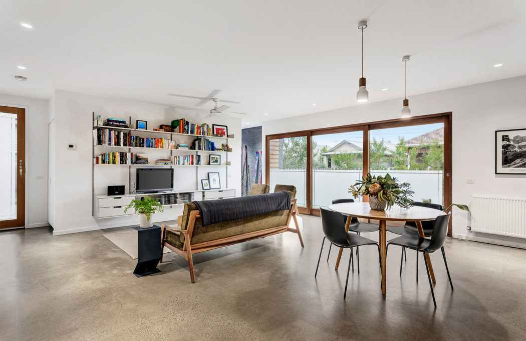 An open living room and kitchen fills the ground floor, which has cool concrete floors, crisp white walls and a kitchen decked in white subway tiles. Sliding double doors tumble out onto the property’s enclosed patio.