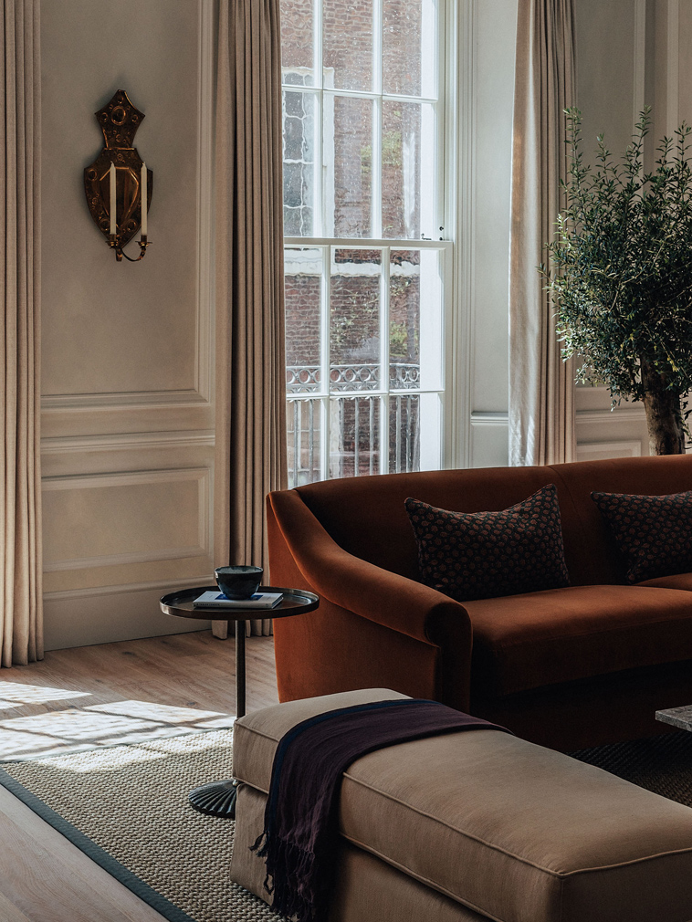 The debut apartment, comprising two bedrooms over 185 sq m, balances history with the elegance of a modern boutique hotel, layering velvet, honed marble, antique brass and linen against a calm tonal palette with ceiling heights reaching a lofty 3.1m. As a bonus, they offer rare dual-aspect views towards Green Park and Hyde Park.