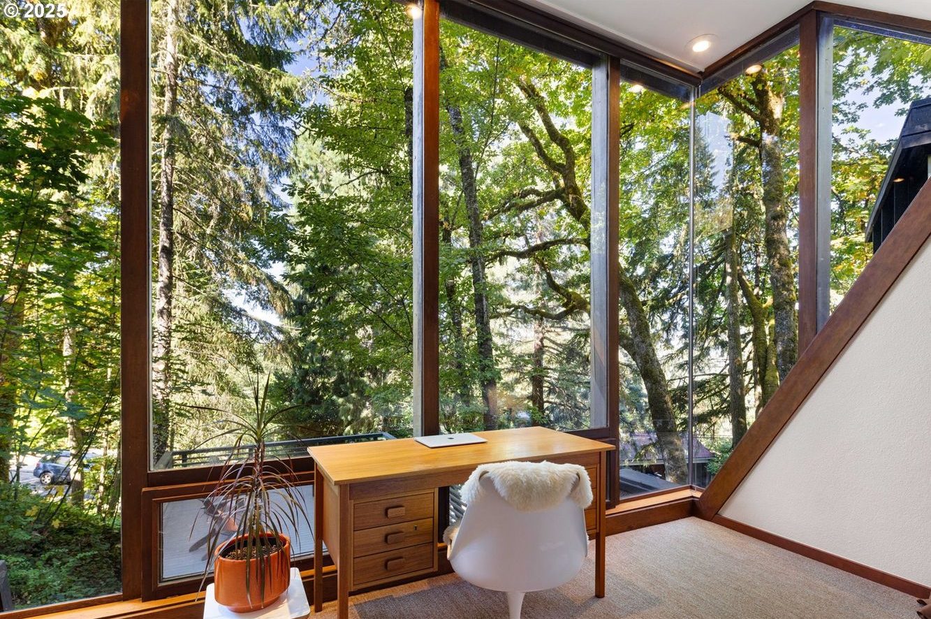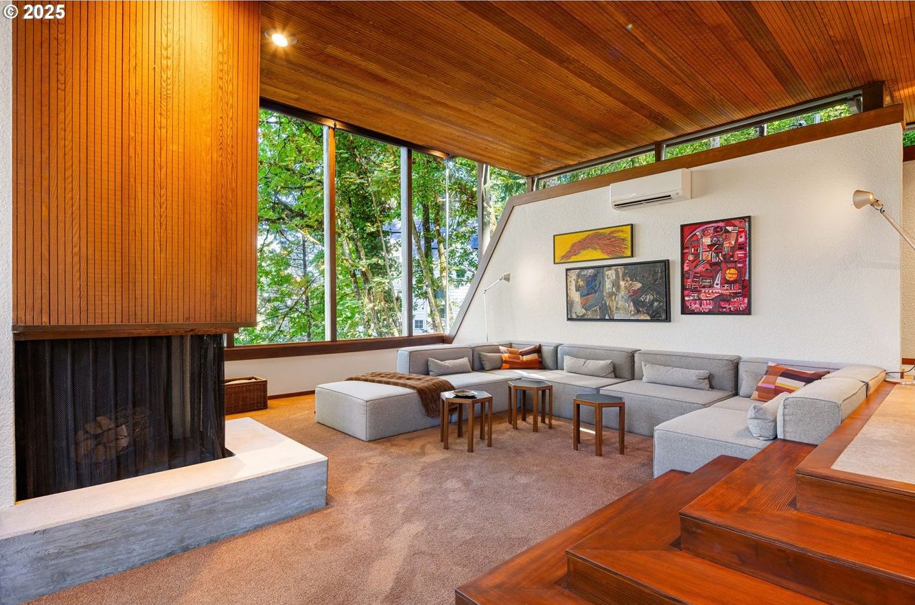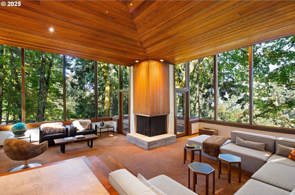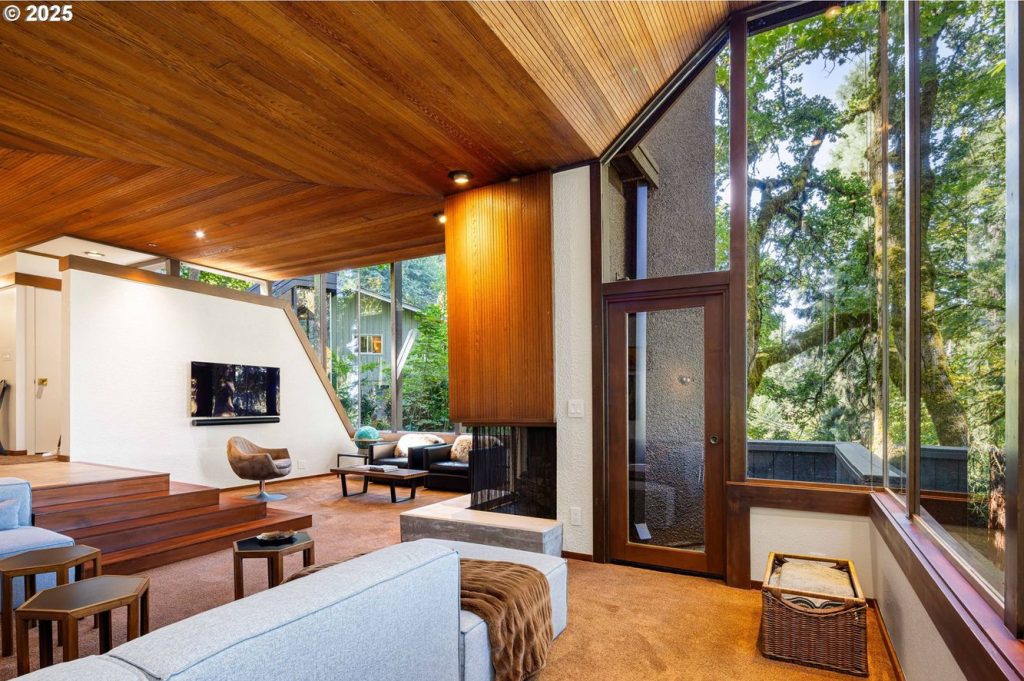 Seen through the trees, this 1965 house is a sequence of elevated pavilions. Designed by local legend Otto Poticha, it sits lightly on its wooded site near the University of Oregon, outside Eugene, its timber decks and glazed corners stepping around mature trunks. From the outset, the architecture prioritises immersion and outlook, a quality reinforced by floor-to-ceiling picture windows and cedar-lined ceilings that remain intact.