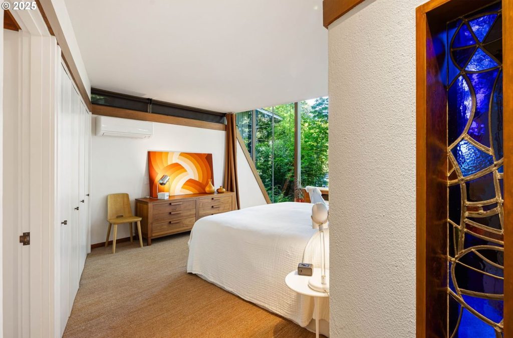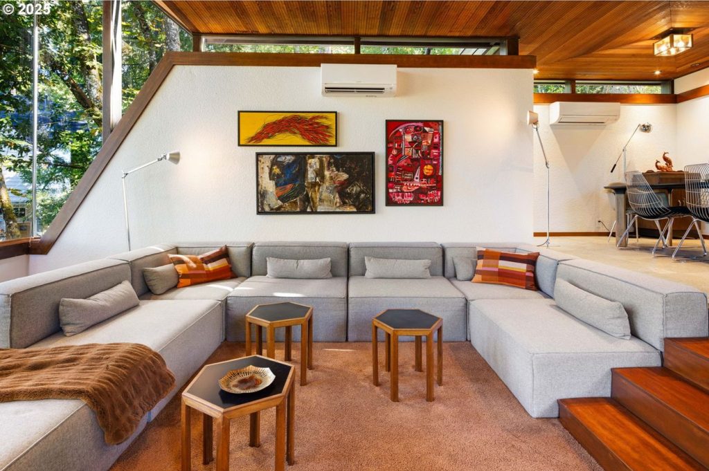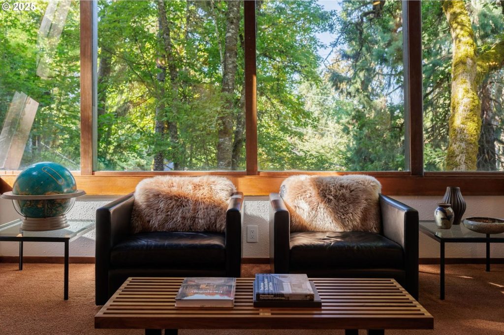 Below, a second bedroom and bathroom are paired with storage, allowing the house to function across two levels without excess circulation. Infrastructure upgrades — including roof, HVAC, electrical systems and finishes — are complete, but remain visually discreet. At 1,757sqft, the two-bedroom house balances intimacy with openness, using structure and glazing to stay closely tied to its forest setting. It’s listed for $1.095 million with Windermere Real Estate.
