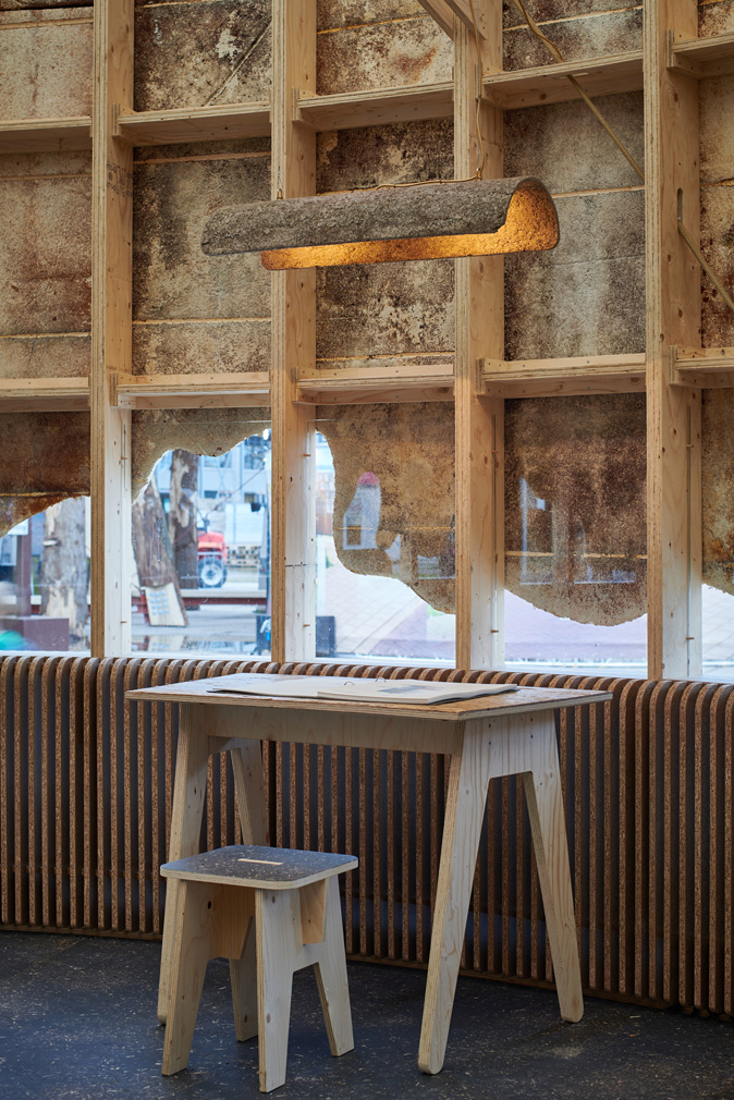 The biophilic structure is designed to show the potential of biodegradable materials, with floors made from reeds and benches built using timber taken from trees that fell in a recent storm in Eindhoven.
