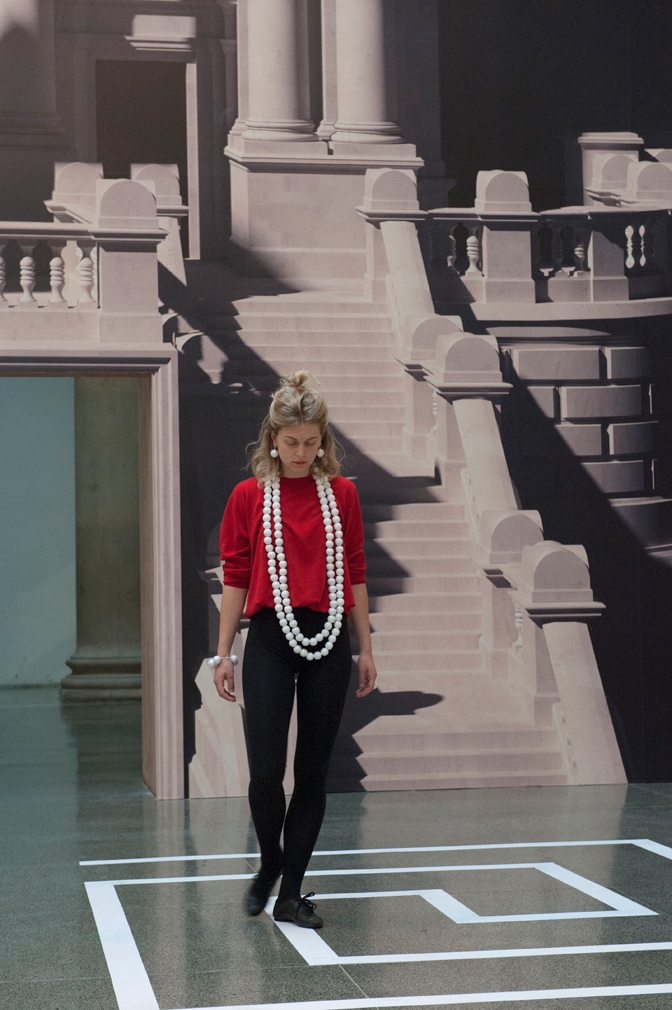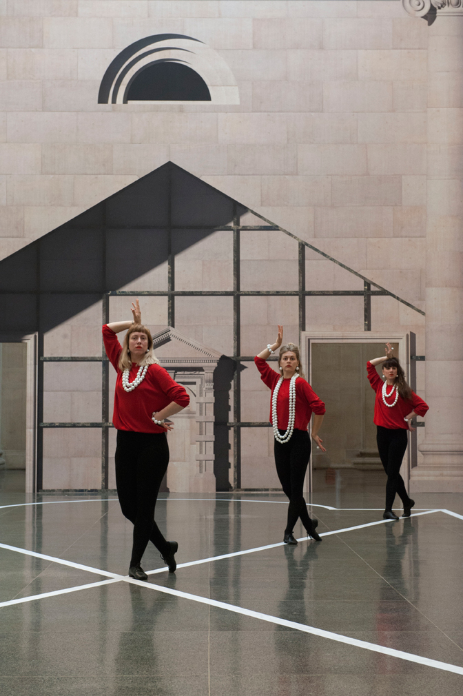 To compensate for what Bronstein calls the ‘really grim and dark’ galleries, he dressed the dancers in contemporary red sweaters as well as classical ballet tights. Their movements are accentuated with outsized beaded necklaces, bracelets and rings, which not only offer points of focus, but also lend their interaction in the galleries the air of 1980s power lunch.