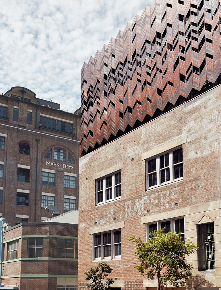 A two-storey extension was added to connect Paramount House with the previously vacant building next door — formerly a film storage warehouse for Paramount Picture Studios. The two buildings are adjoined by a Herringbone-patterned copper-clad screen, which wraps around the roof to create a unique façade. The hotel’s rooms are located within the upper floors of the newly connected buildings, with the lobby based on the ground floor.