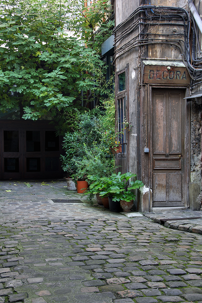 The Paris apartment’s wrought iron balcony overlooks the greenery filled courtyard below, dotted with fig and bamboo trees.