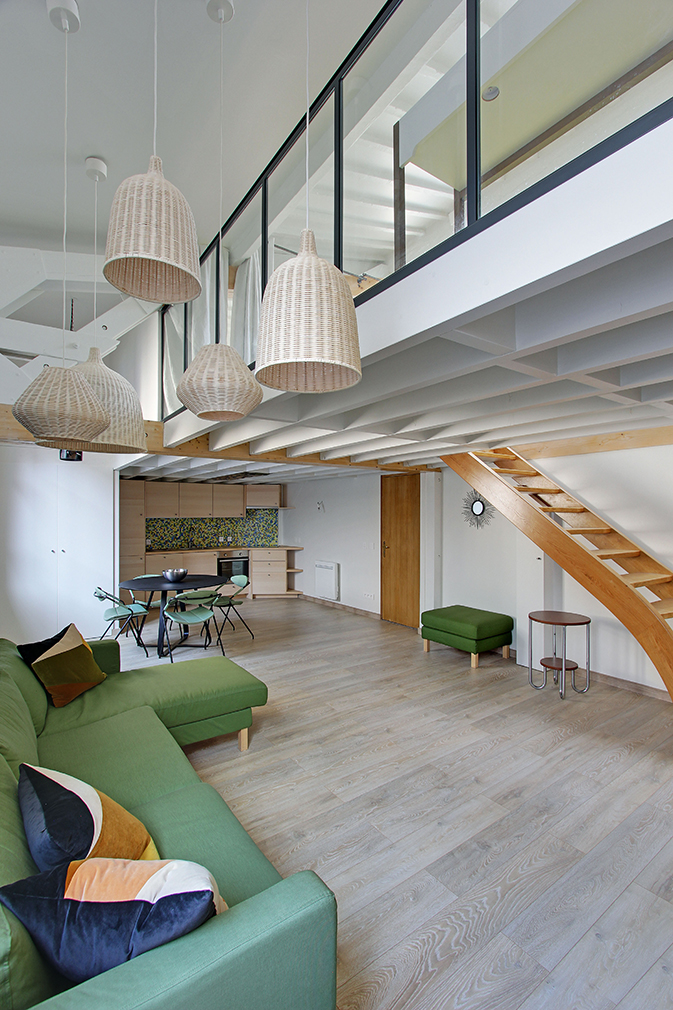 Its kitchen and living room feature exposed beams, while the bedroom is tucked on a skylit mezzanine beneath the pitched roof. Wooden floorboards and oak cabinetry have been teamed with white walls throughout the 68 sq m apartment.