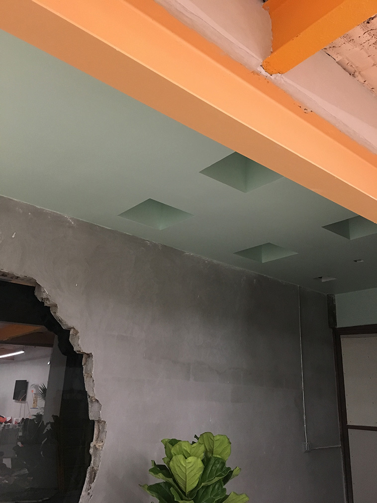 Playful bursts of colour – tropical peaches and mint greens – break up rendered walls and concrete floor tiles, while large windows have been added to cinderblock walls – the edges of the panes visible. Furniture was also designed by the collective and was welded on site.