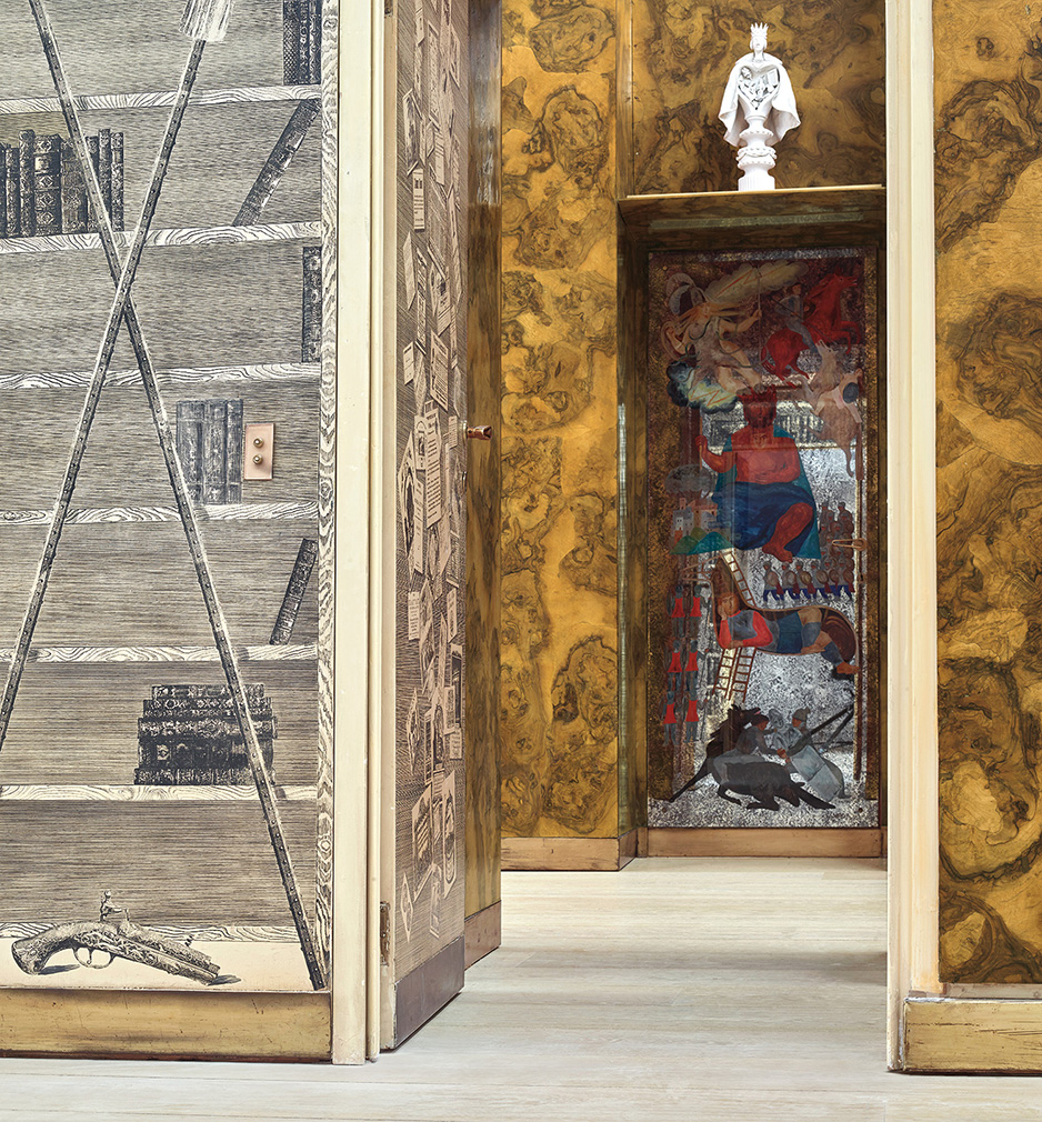 Phillips has recreated the lost interiors of Milanese apartment La Casa di Fantasia, which Ponti designed for the Lucano family in 1951, ahead of the auction of its interior collection on 21 March. Ponti tapped his creative contacts to decorate the postwar pad – which blurred elements of Italian Metaphysical and French Surrealist art – including Piero Fornasetti, who papered its walls with his illustrated designs of playing cards and books.