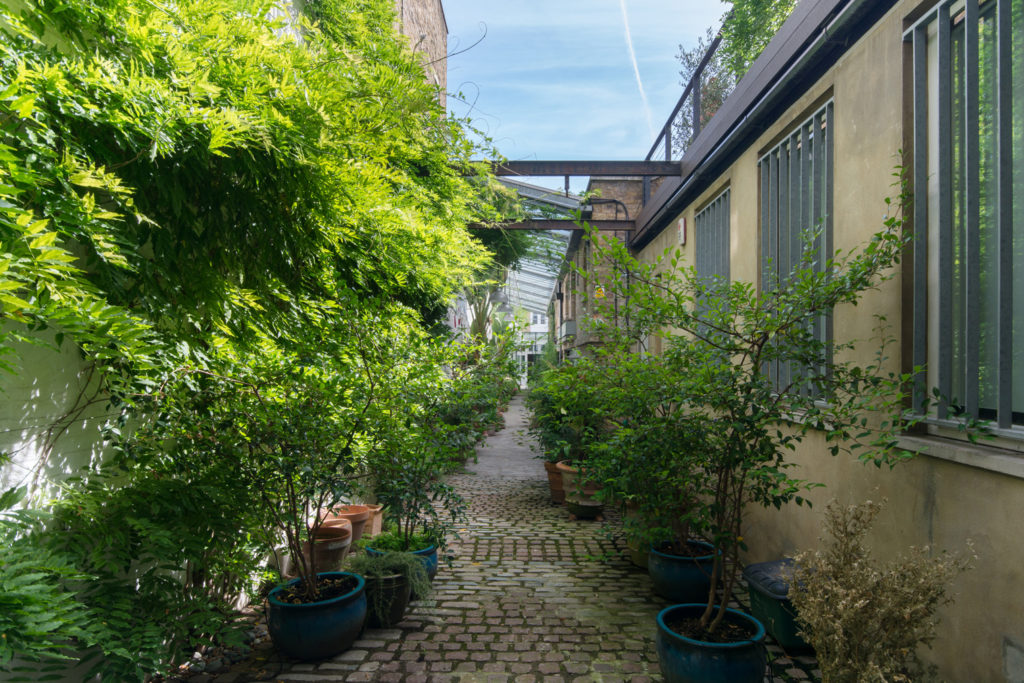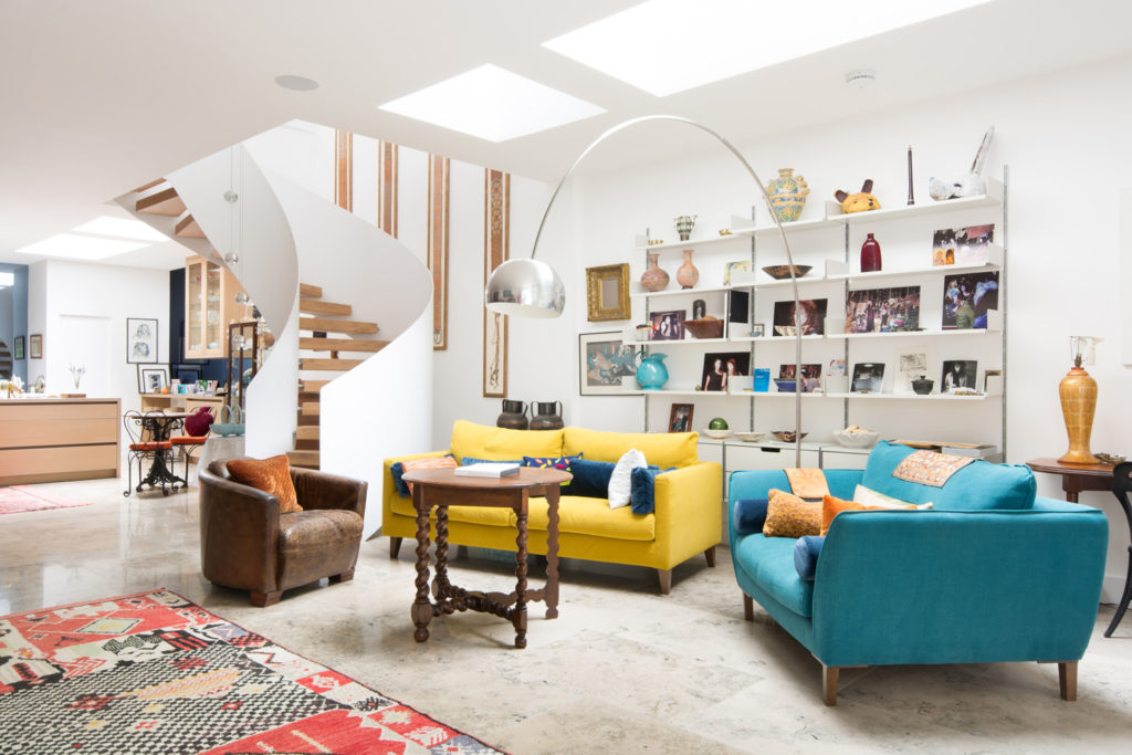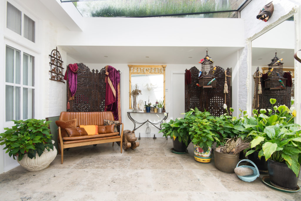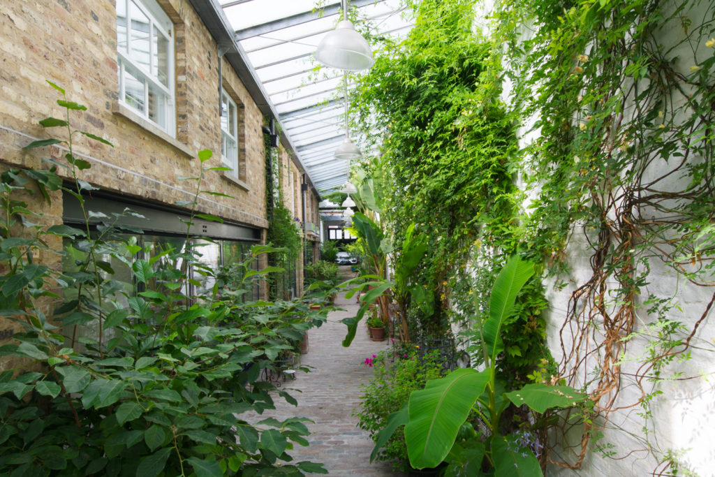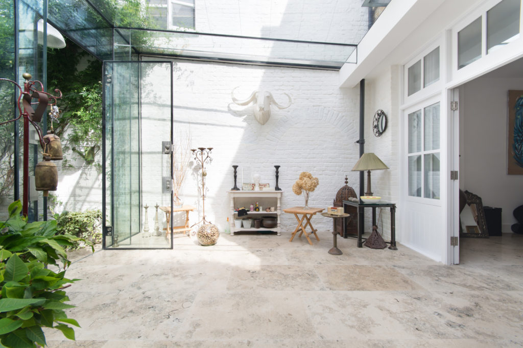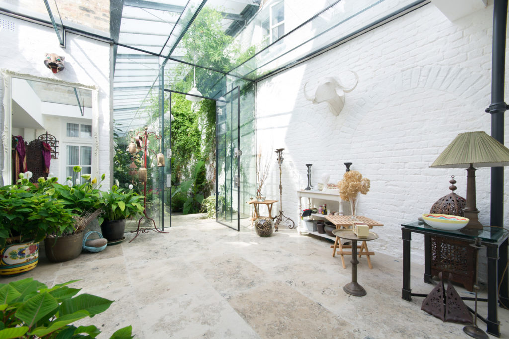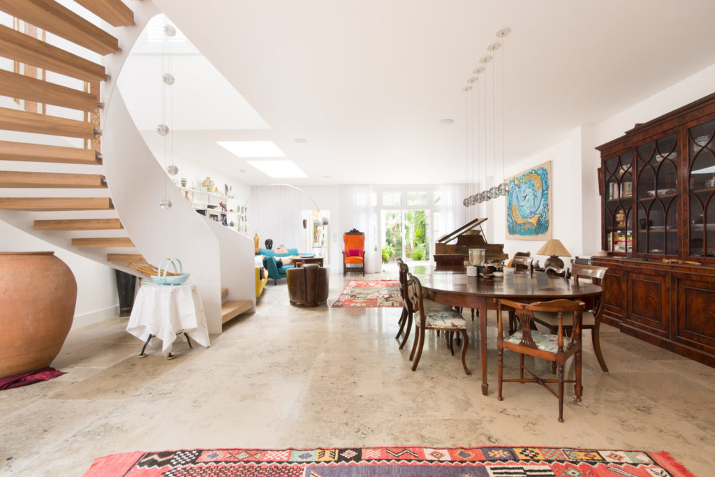 St Stephen’s Yard is accessed via a glass corridor filled with plants. The London property covers 464 sqm across two storeys and is on the market with Domus Nova for £10.95m. At the rear of the ground floor is a vast reception, kitchen and dining room, floored in polished stone and overlooked by a dramatic, swirling staircase.