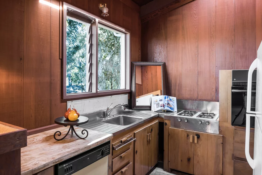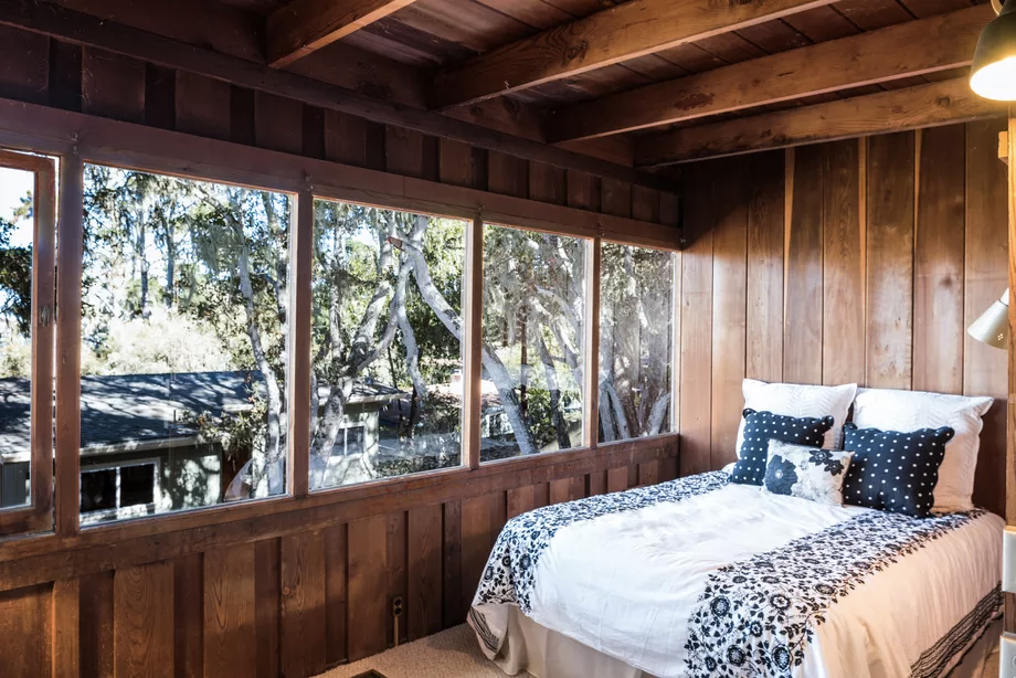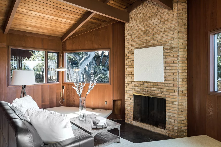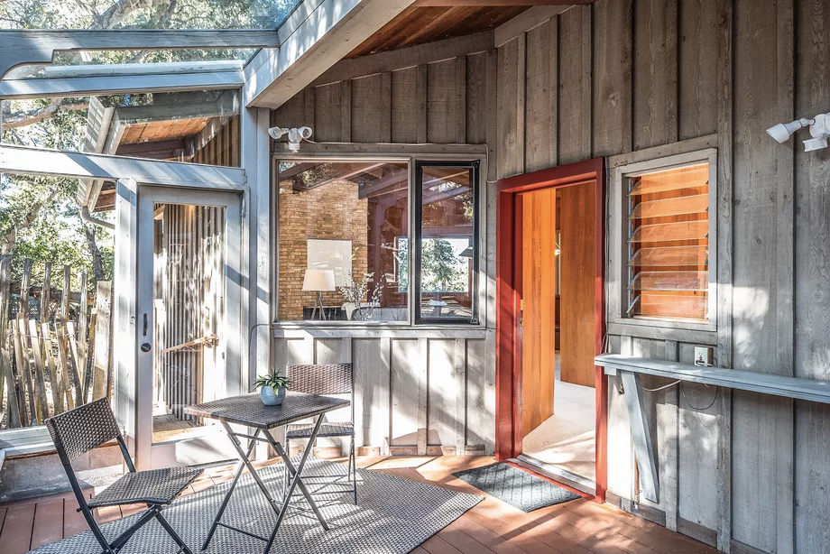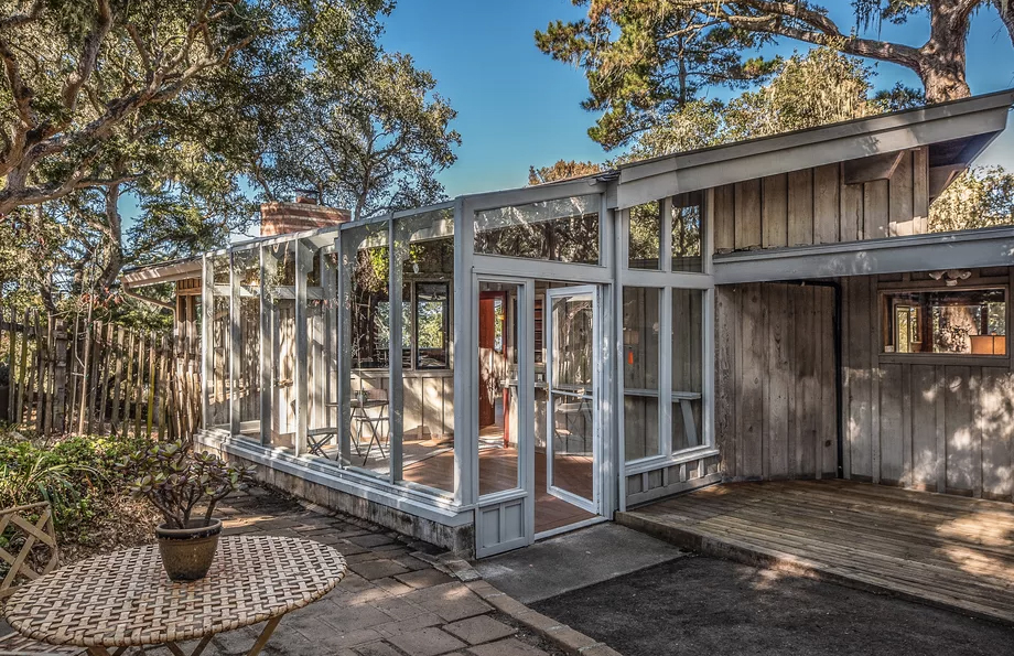 The Pacific Grove property is for sale via Sotheby’s International Realty and was built in 1947. It retains much of its prewar charm (and original features). The soaring central living room has a pitched beamed roof and an open brick fireplace.