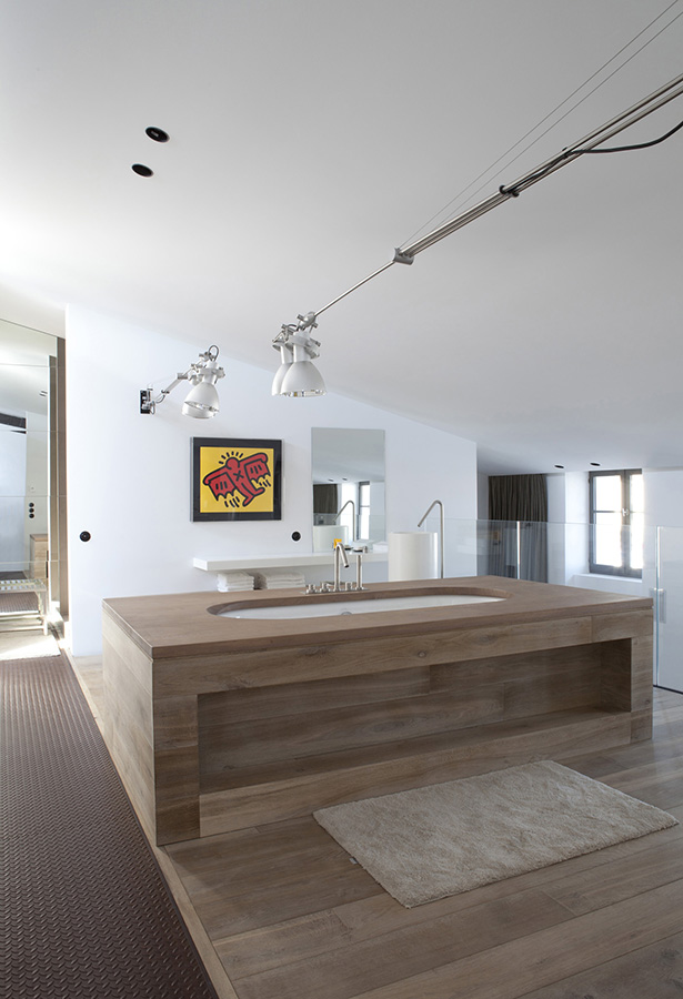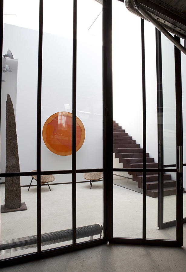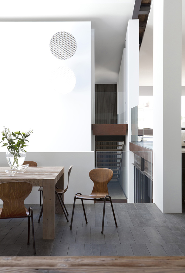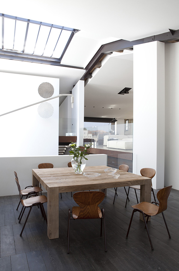 The challenge for the architect was retaining the shipyard’s historic shell while gutting its interiors and creating a flow between the twin buildings. Key to the redesign is a wide central staircase topped by a skylight, which funnels light into the open-plan living areas and master bedroom on the home’s upper two levels.