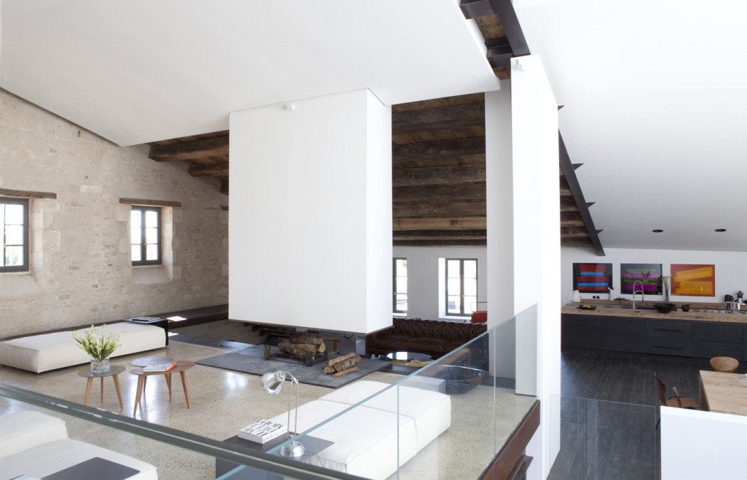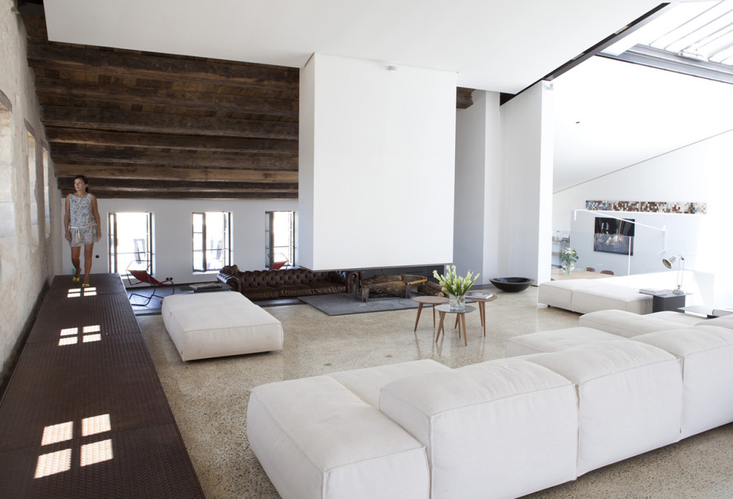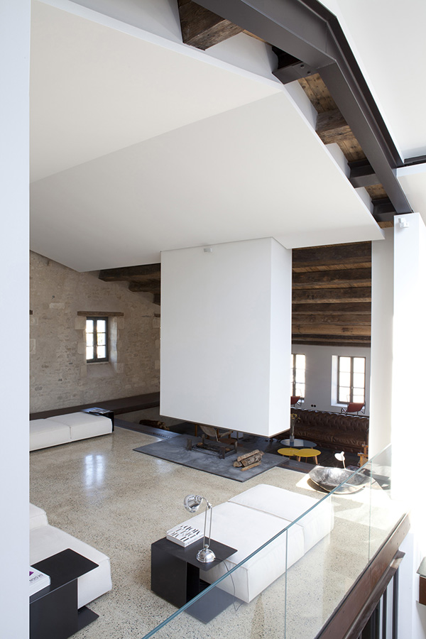 Original stone walls and beams are exposed, while contemporary insertions are crisp, white and linear. Large picture windows offer panoramic views over the bustling harbour.