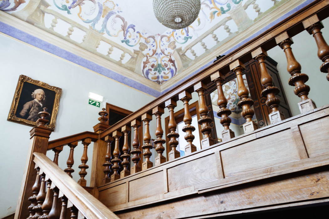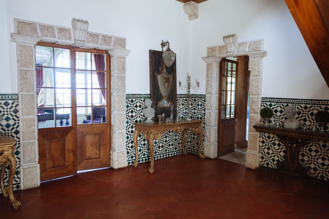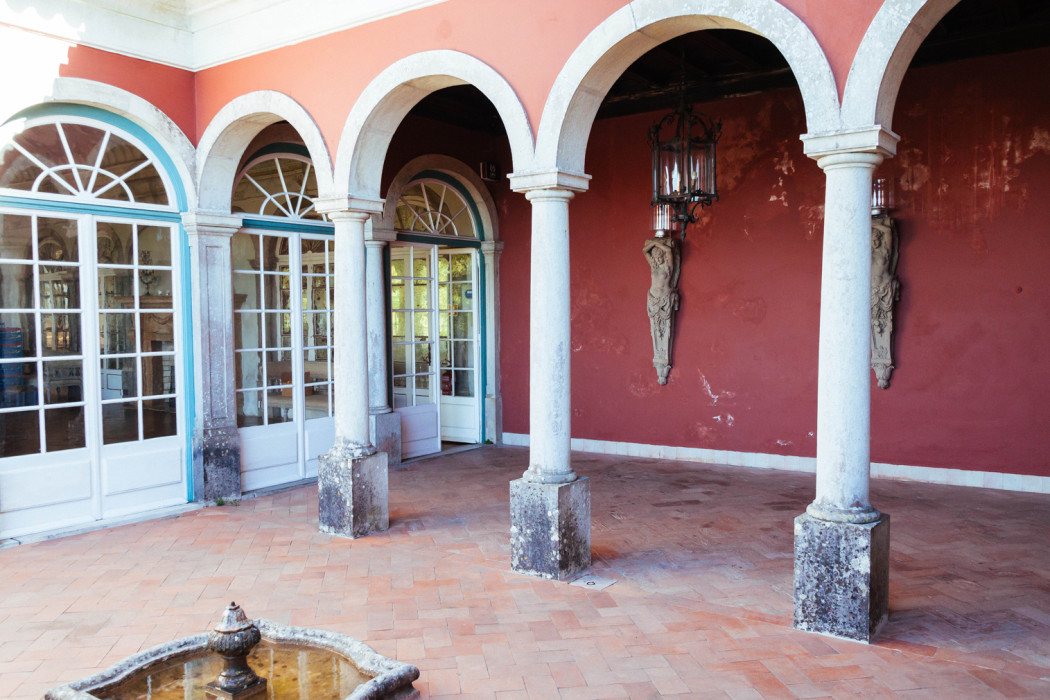 Lino designed every aspect of the nine-bedroom property, down to its custom-made chandeliers and ceiling frescoes, and sprawling gardens that include a lake and a sculpture garden. The property retains these features, as well as original marble and stone fireplaces, parquet flooring, and azuleijos (ceramic tiles) typical of the Sintra area in the grand entrance hallway.