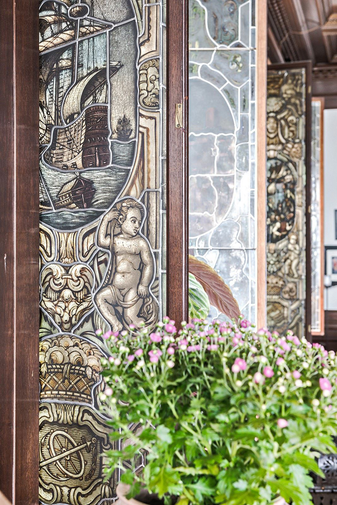 Painted ceilings and stained-glass windows are some the decorative details inside this 1929 Swedish home overlooking the sea.