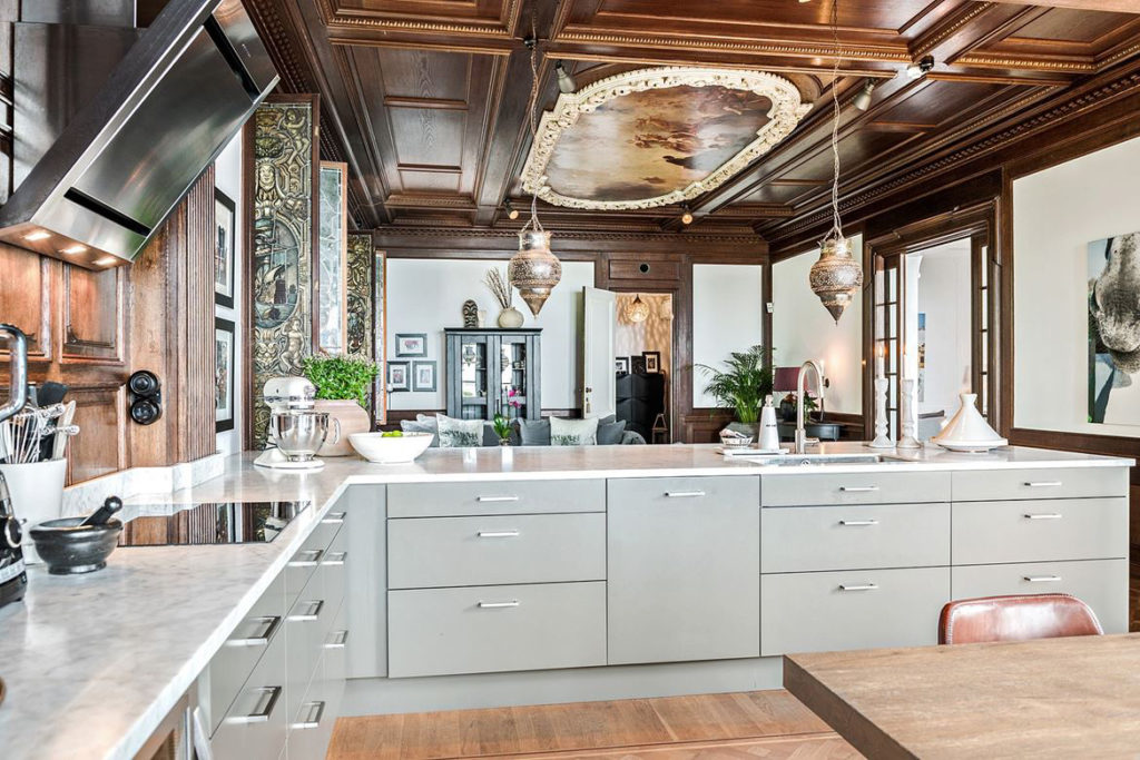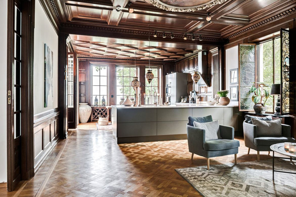 Parquet floors, wood panelling and towering coffered ceilings contrast freshly painted walls and a sleek new kitchen.