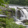 A separate patio, connected by a walkway, hovers at the edge of the waterfall’s drop for those comfortable with heights.