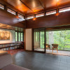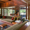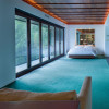 The six-bedroom property’s concrete and timber frame gives way to a predominantly wooden interior. Each room is orientated towards the water and surrounding 26-acres of Hudson Valley woodland, while the open-plan living room has glass exterior walls that can be pulled back, opening the house up to the elements.