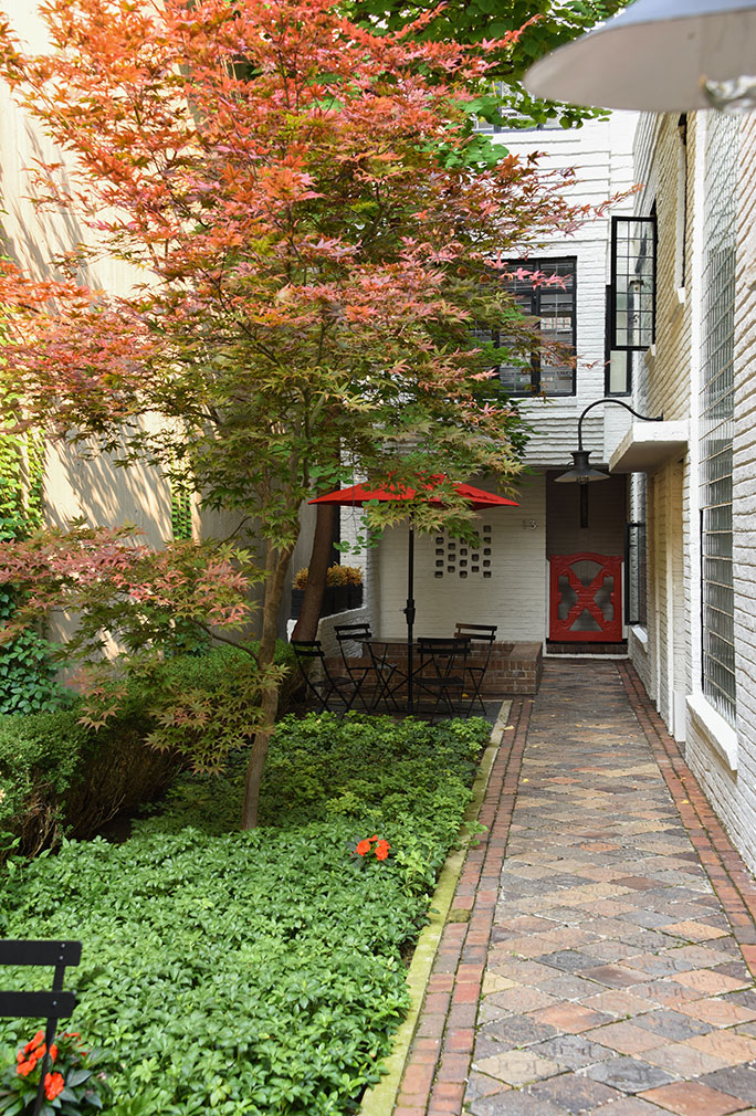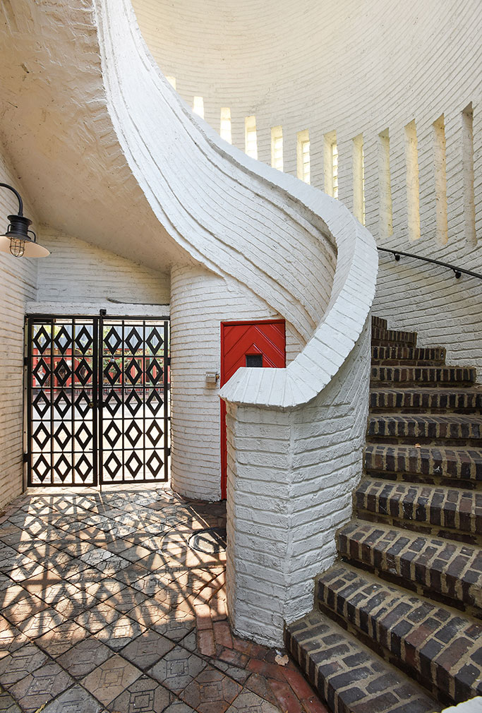 Chief among these is the curvaceous Art Moderne Frank Fisher Studio Houses, striking a sly and streamlined pose on the block. Behind painted brick walls and an iron gate, the building is deceptively deep, with a dozen units facing a shared courtyard. Each dwelling is duplexed with trademark handmade stairs, herringbone floors, wood-burning fireplaces, glass block windows, and mosaic bathroom details.