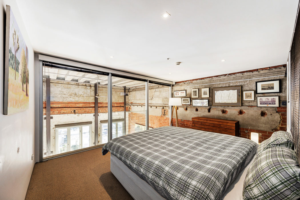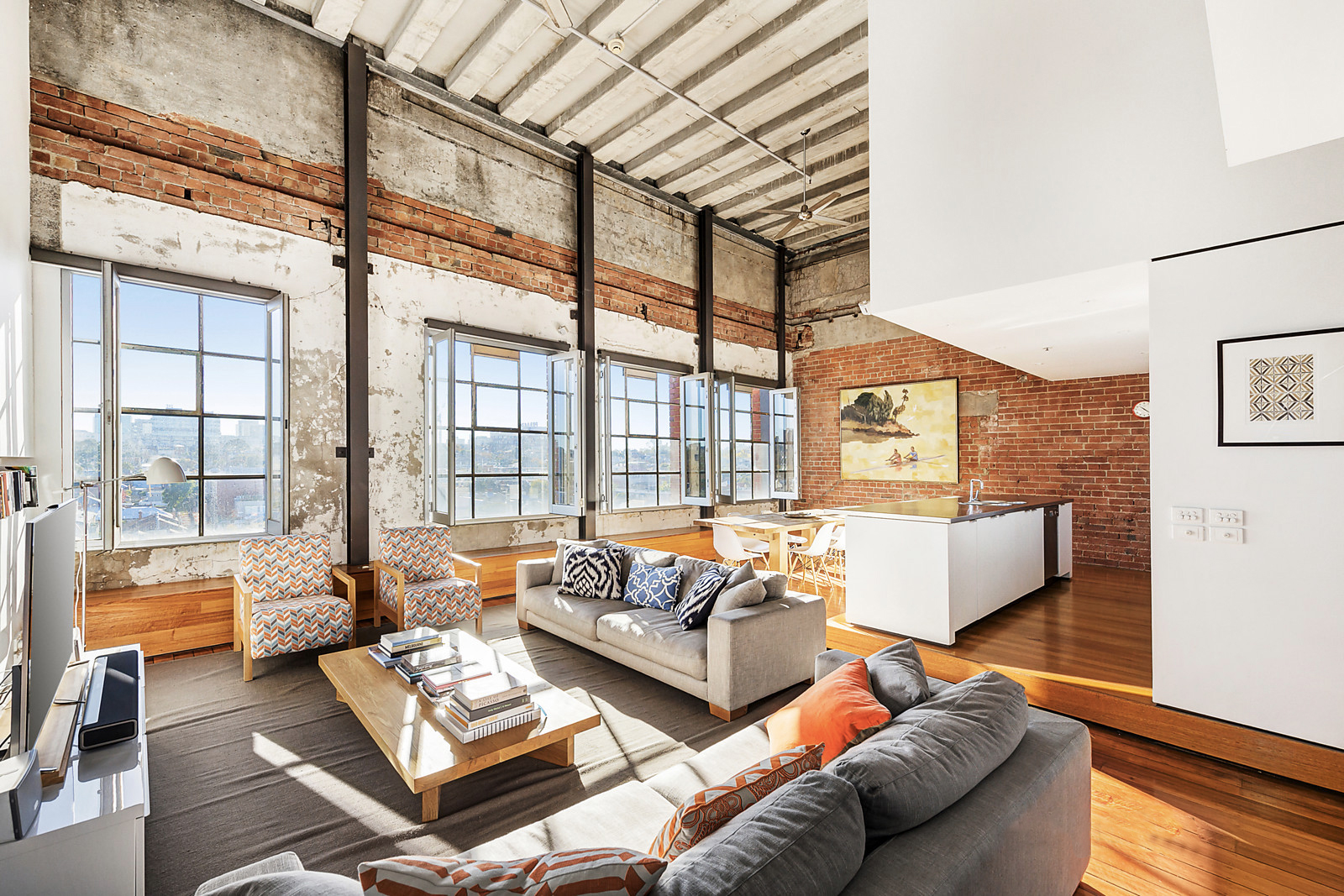 It takes up the top floor of a Richmond former garment factory that dates back to the 1900s. The property was sold as a shell in 2000, before the owners enlisted Pleysier Perkins Architects to design its interior fit-out and carve the double-height volume into living spaces.