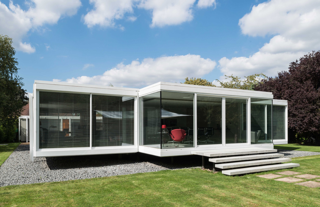 With its glazed facade and boxy steel-frame, this Berkshire home evokes the Californian sensibilities of the Case Study housing experiments.
