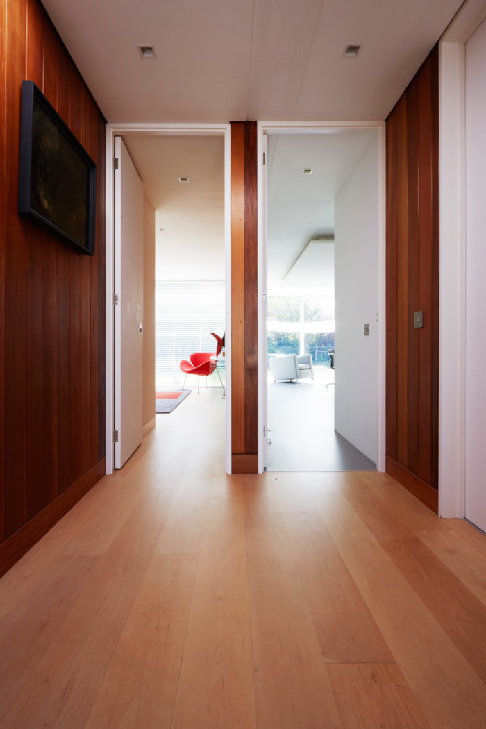Like its Californian cousins, the Holyport property ‘floats’ above the ground on stilts. Granite steps lead up from the garden into the property’s red cedar-clad hallway.
