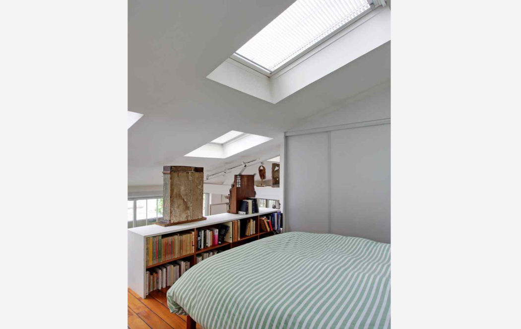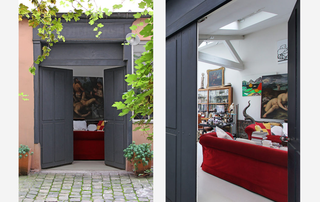 Set off a quiet, cobbled courtyard in the Louis-Blanc-Aqueduc district of the city, the dwelling was once the studio of designer Gilbert Poillerat, a master wrought-iron craftsman. It’s current owners have continued the creative connection, filling the 155 sq m studio with bookcases and lining its vast walls with canvases and sculptures.