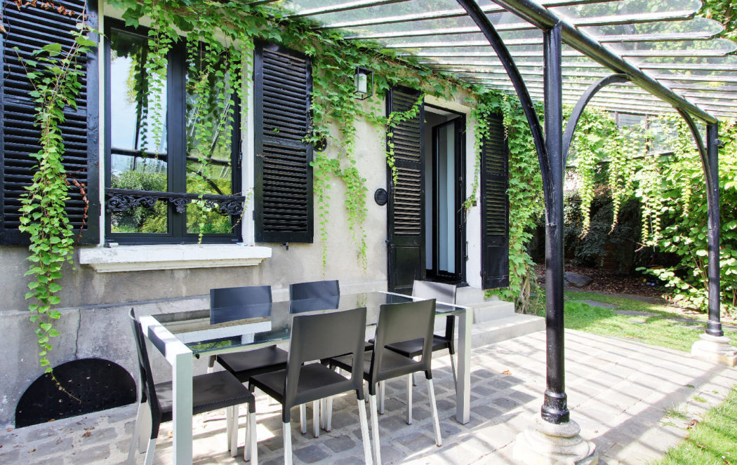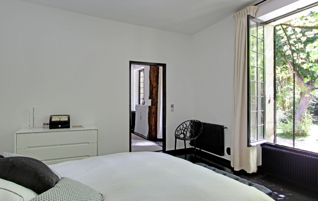 A glass walkway and stark black-and-white colour palette unite the two dwellings. White walls are offset by black-framed windows, doors, and painted floorboards. Even the exterior has been given a monochrome makeover, with the property’s traditional French shutters reimagined in a moody black.