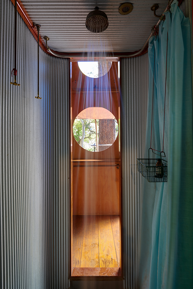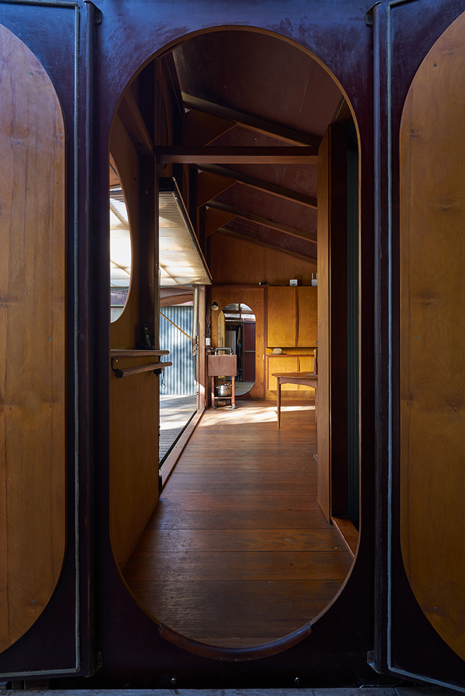 The large deck connecting the pavilions acts as an outdoor living space. Leplastrier’s also ditched conventional demarcations of private and public across the two bedroom home, tucking a shower pod into the kitchen. The cabin meanwhile has been refashioned as a living room or study – complete with new custom cabinetry, original doors and windows.