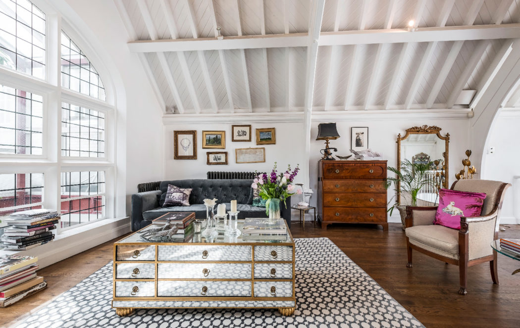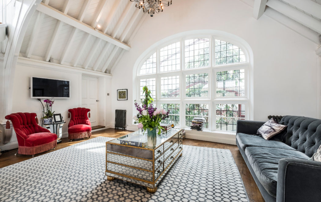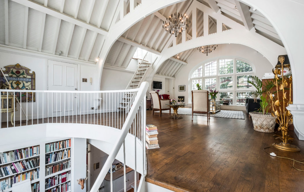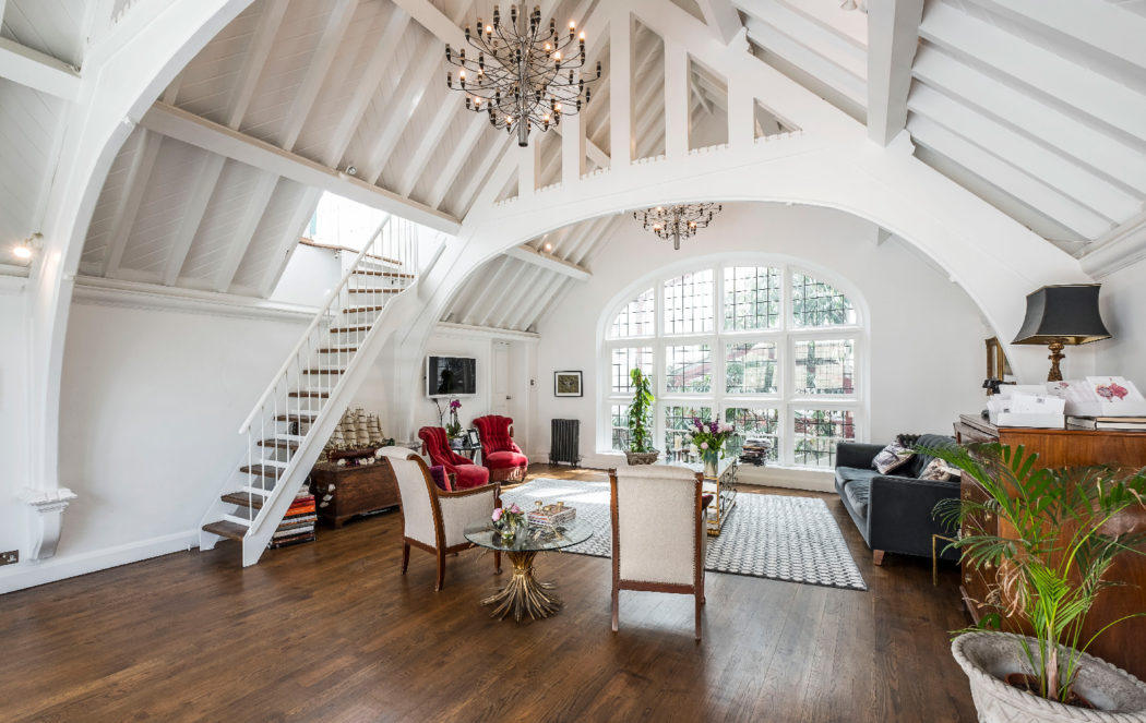 This voluminous space is bookended by triple height windows, which bathe the room in light. Walls and exposed beams have been painted white, exaggerating the sense of the space, while original features such as doors and stained glass windows have been retained.