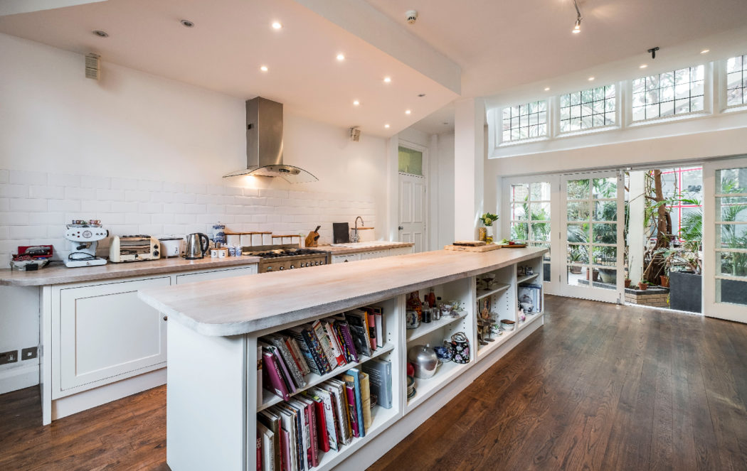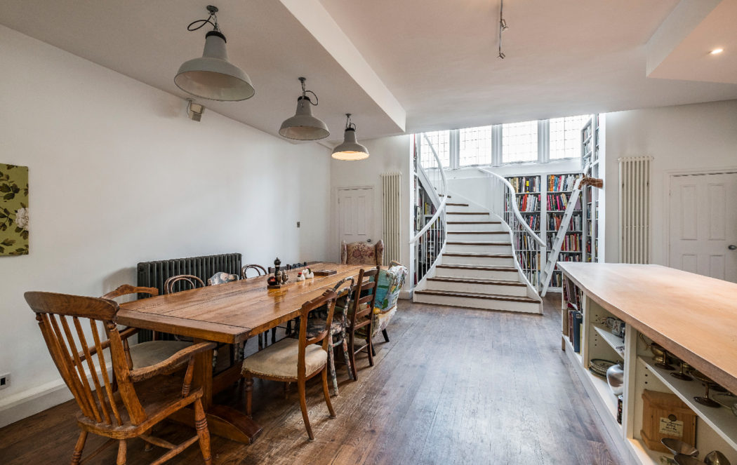 On the ground floor of the adaptive reuse project is a guest bedroom and cosy library study, which is wrapped in bookcases. Running the full width of the property is a large kitchen and dining area seating up to 10 people. French doors open out to the apartment’s private leafy courtyard, while a curving staircase leads upstairs to the living room.