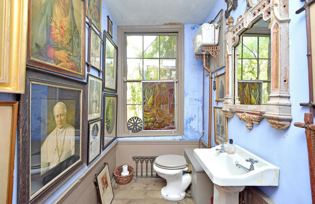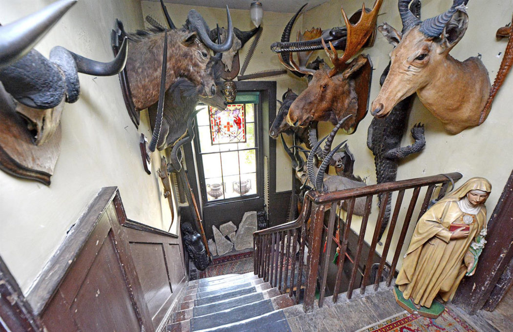 Walls are covered in collected taxidermy, religious iconography and trinkets belonging to the property’s owners. But a lasting addition to the house is a Baroque-style chimney piece by artist Christopher Hobbs, commissioned by the owners in 2003.
