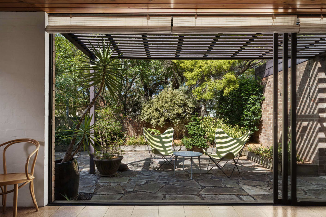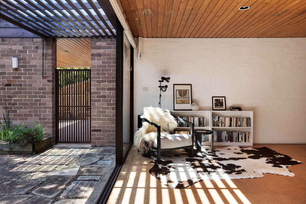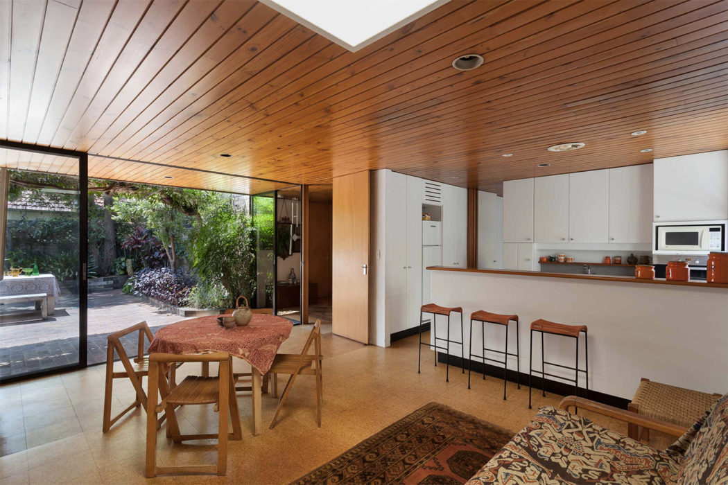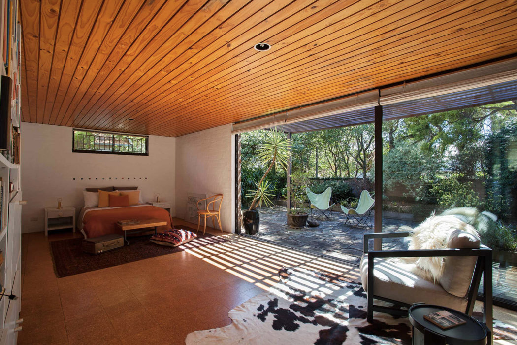 Three bedrooms fill the short arm of the L, and are stocked with period features such as painted brick walls, cork floors and timber-slatted ceilings. Custom cabinetry and wood-panelling have also been preserved throughout the midcentury Australian home.