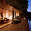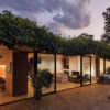 The 1,851 sq ft Sydney property is modest in scale but it’s highly function. Rooms inside the ‘L-shaped’ home are light-filled and fold around the swimming pool. The kitchen and living room feature triple-fronted glass doors that open onto the terrace, and there’s a full size tennis court and landscaped gardens behind it.