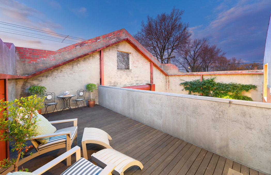 In fact, you could say this property is as much about the outdoor space as it is the indoor… It is bookended both sides by high-walled patios set within the old building’s walls. Upstairs, the master bedroom also has a private terrace nestled in what would have been the eaves of the factory’s roof, now open to the elements.