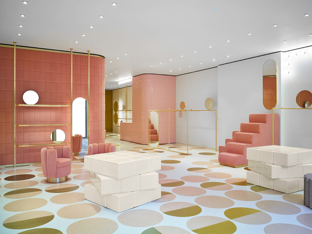 Brass-edged circular mirrors hang on walls – a motif echoed in the store’s flooring, which features pink and mustard discs. Elsewhere, Rubik’s cube-like display stands dot the space.