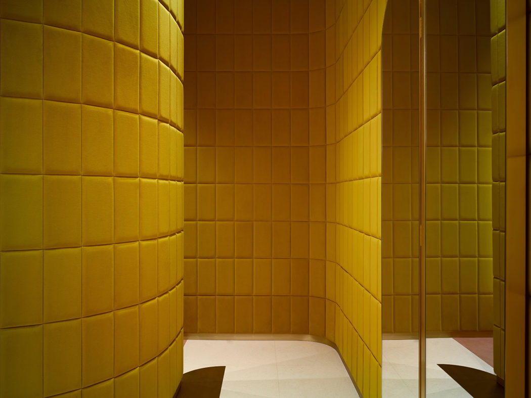 Starting with a base of white terrazzo, Mahdavi has added soft pops of colour through voluptuous, dusky-pink chairs by the designer, and curvy mustard and salmon coloured walls.
