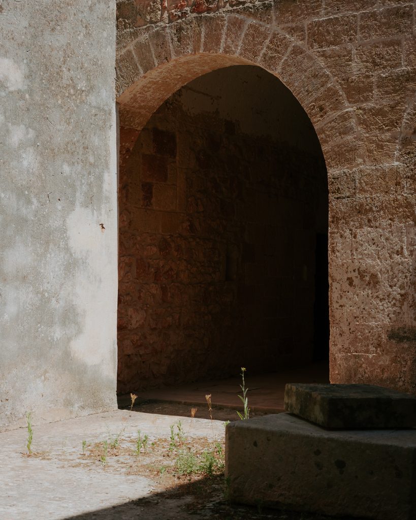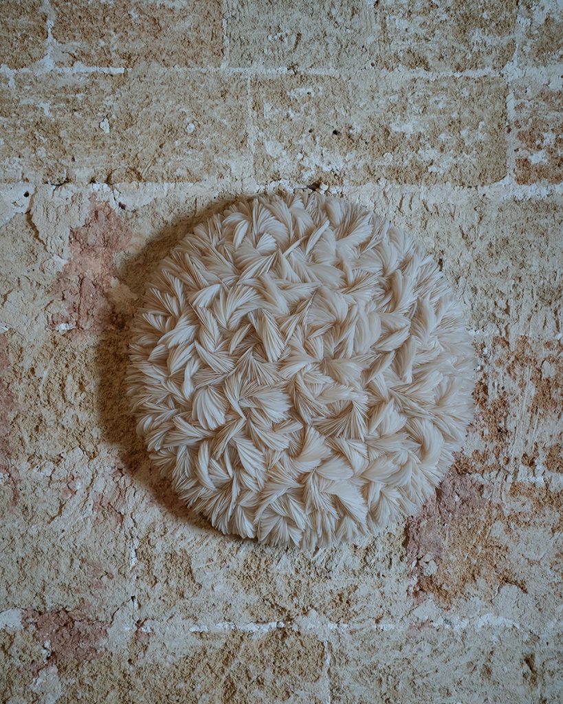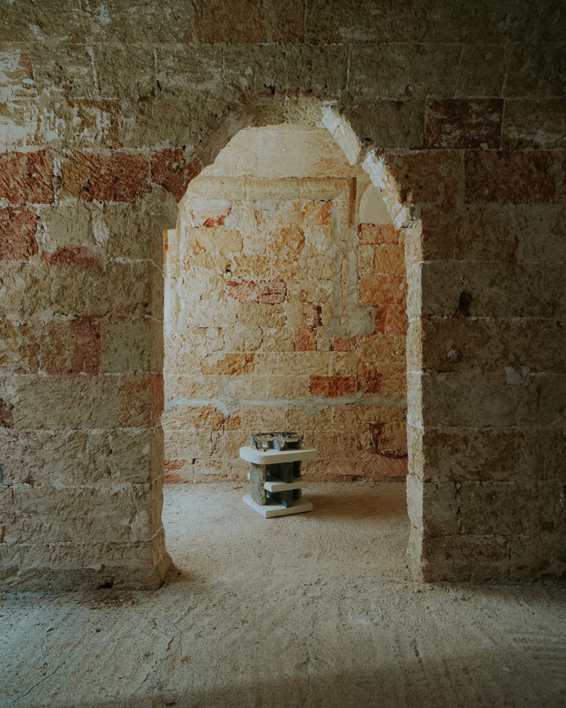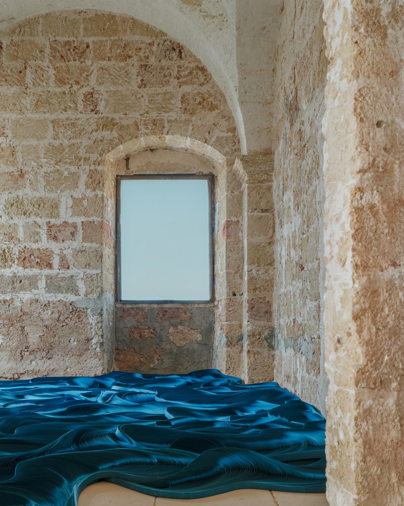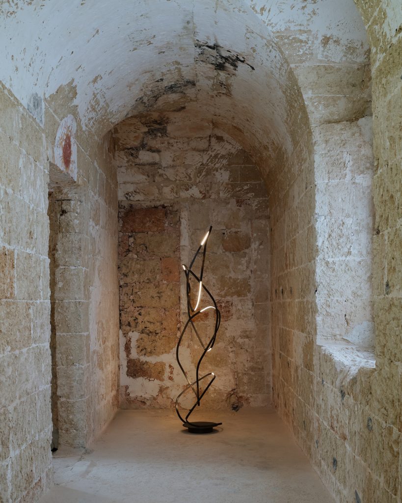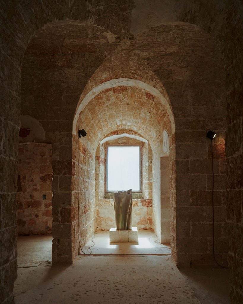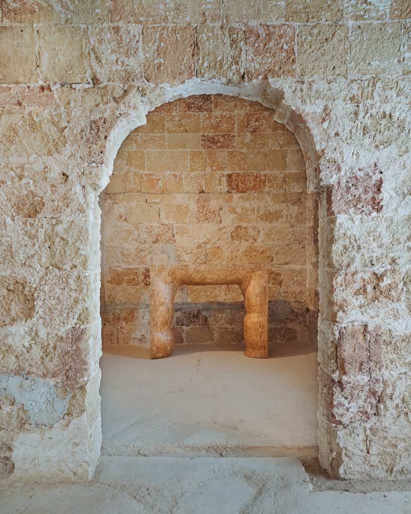 To activate the ancient, frescoed spaces of the 17th-century monastery, curators Valentina Rito and Giacomo Niccolai have focused on three interconnected themes. ‘Light and Ritual’ examines the heritage of lanterns and lamp oil as symbols of rural life. ‘Threads and Weaves’, drawing inspiration from Salento’s textile tradition, features the 1/1/1 textile series by 6:AM, which poignantly incorporates Lecce stone dust in a natural weave. And ‘Matter and Roots’ explores ancient ties with the land through materials such as Lecce stone, olive wood and trees infected by the xylella bacterium, as in the case of Andrea Vitti’s wooden creations, crafted by local artisan Rodolfo Rolli.