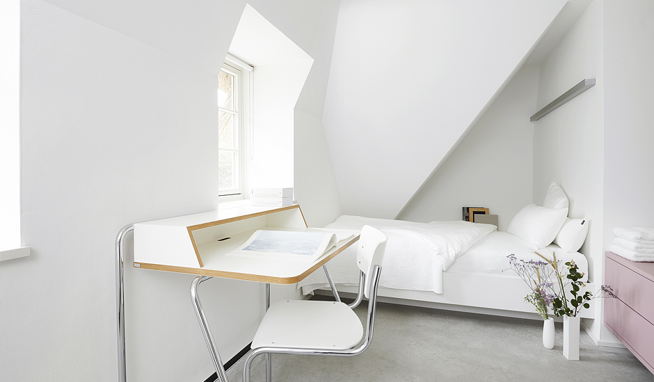 Designed by Grotheer Architektur, House Steuermann’s two apartments are both decked out in Walter Knoll furniture, Thonet chairs and Louis Poulsen lights amid a clean, white backdrop with light touches of wood.