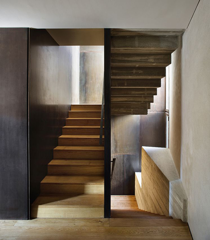 Inside tells a different story, with Noguera introducing a contemporary steel, concrete and oak material palette to the space. Partitions were brought down and the stairway was repositioned. The architect also added a swimming pool to the courtyard garden, fed by the restored cistern.