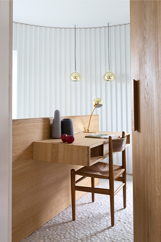 Inside, wooden walls have been painted white and rooms furnished with mid-century style furniture and brass-detailed lighting and fixtures. It’s a nod to the classic Scandi aesthetic, updated with a seaside twist thanks to the beach pebble floor.