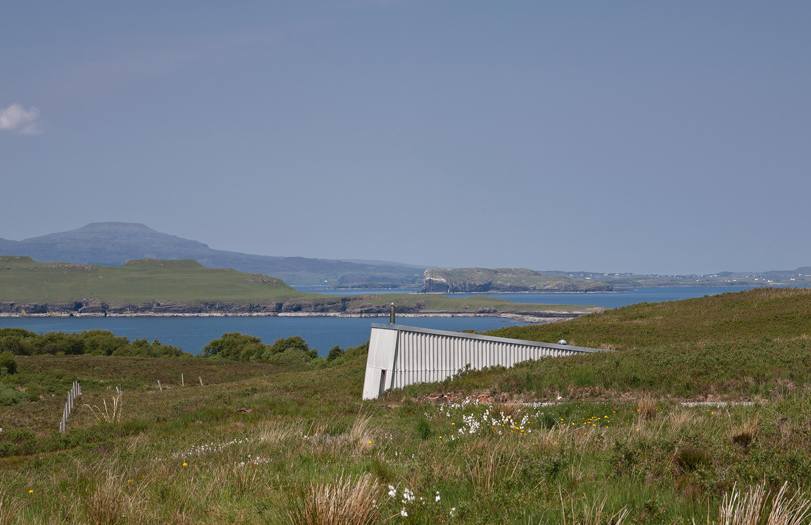Echoing the shape of a fragmented boulder, the single-storey holiday home by Rural Design Architects sits unobtrusively in a shallow drumlin beside Loch Bracadale. Its pitched-roof form features corrugated siding, while the interior dominated by different textures of wood.