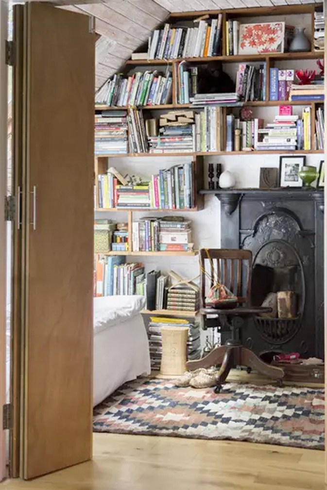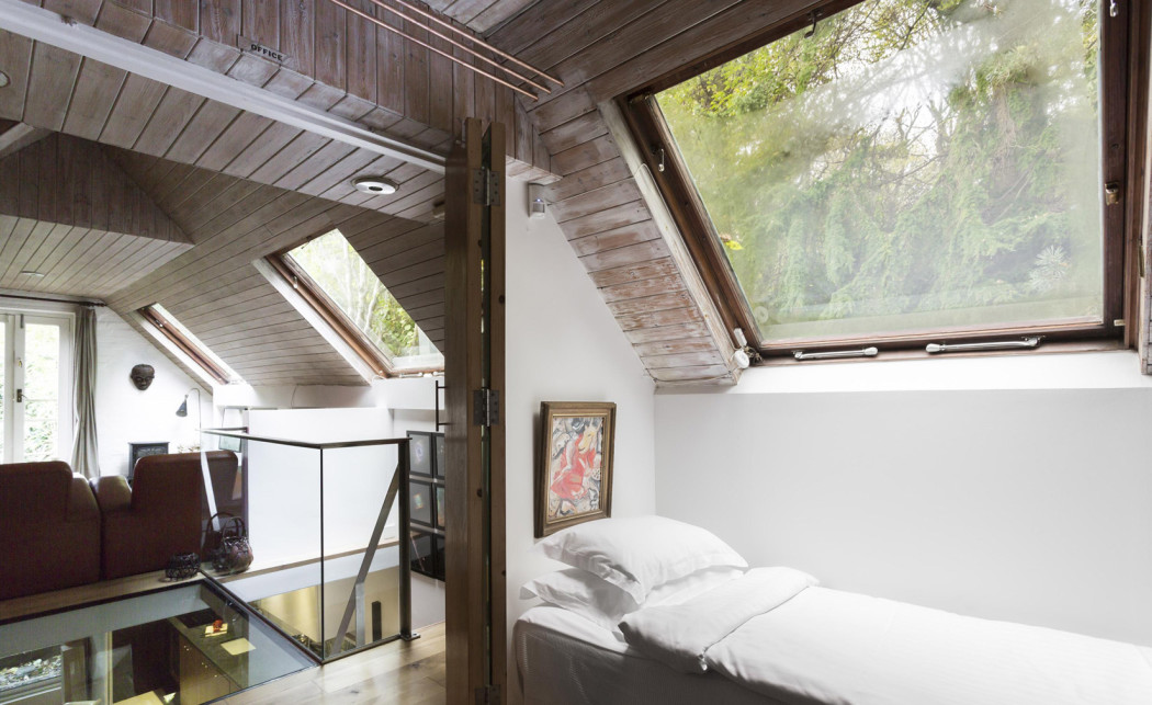 Architect Caroline Ingle bought the semi-subterranean cottage in 1998 and extensively renovated it using reclaimed materials, including limestone and oak flooring. She also restored the cottage’s historic facade, and installed skylights in the sloping roof to peek out over the surrounding nature.
