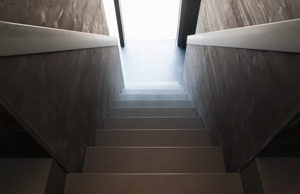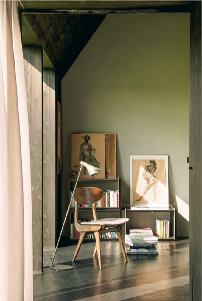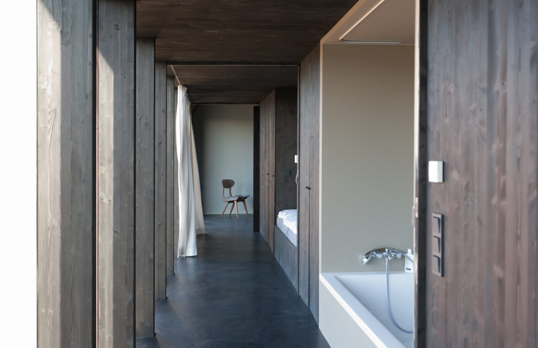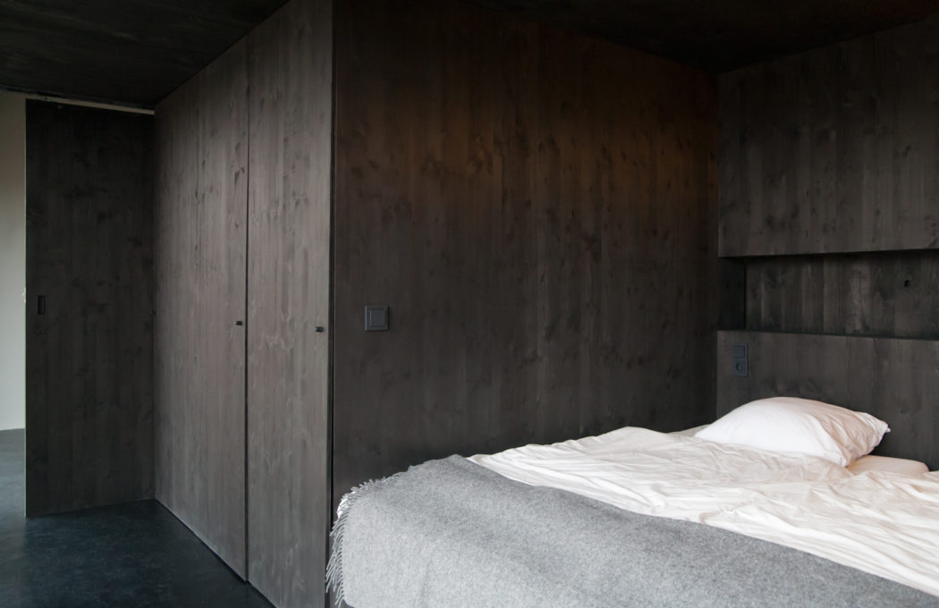 The property takes its name from colour palette – a moody contrast to the surrounding greenery. Dark wood finishes combine with concrete floors and black units in the kitchen.